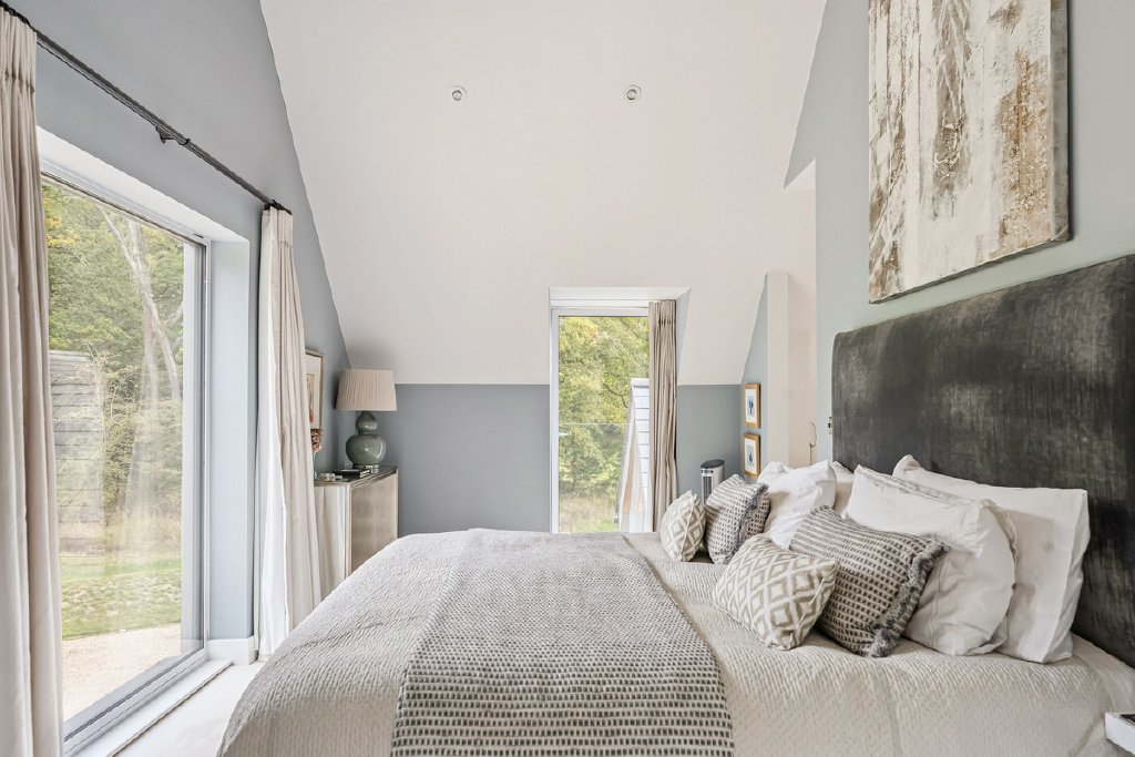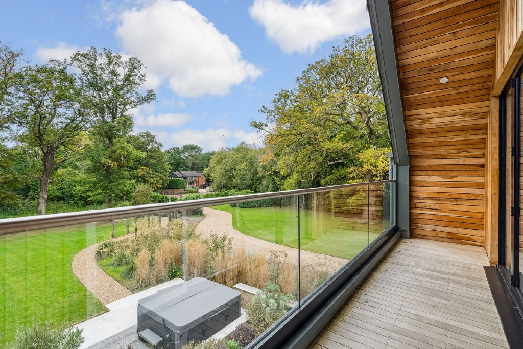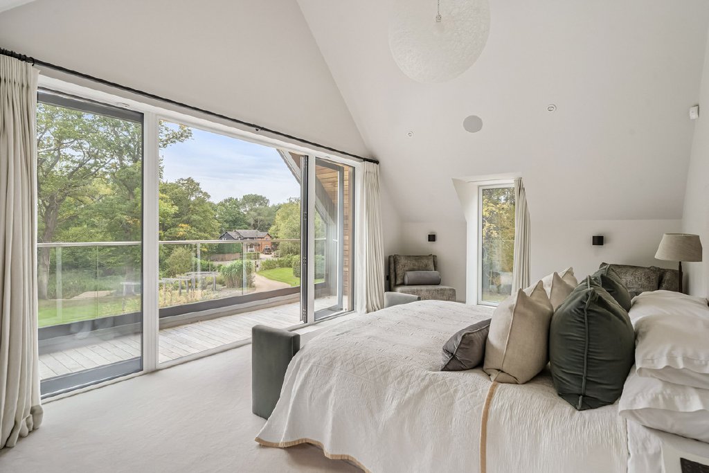 The first floor of the property is home to two further bedroom suites, both benefitting from vaulted ceilings and finished to an impeccable standard. The principal suite offers an extensive range of fitted wardrobes within a private dressing room, a luxurious en-suite bathroom, and double doors leading to a private southerly-facing balcony, enjoying elevated views over the gardens and grounds. The guest suite enjoys a triple aspect with a picture window overlooking the grounds, and includes a private dressing area and en-suite bathroom.