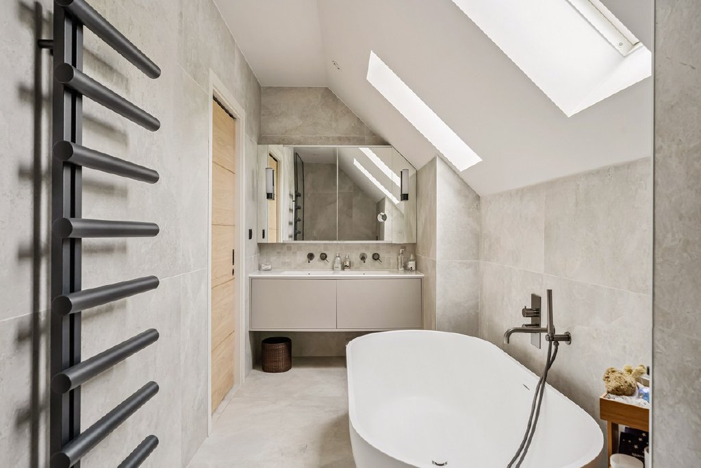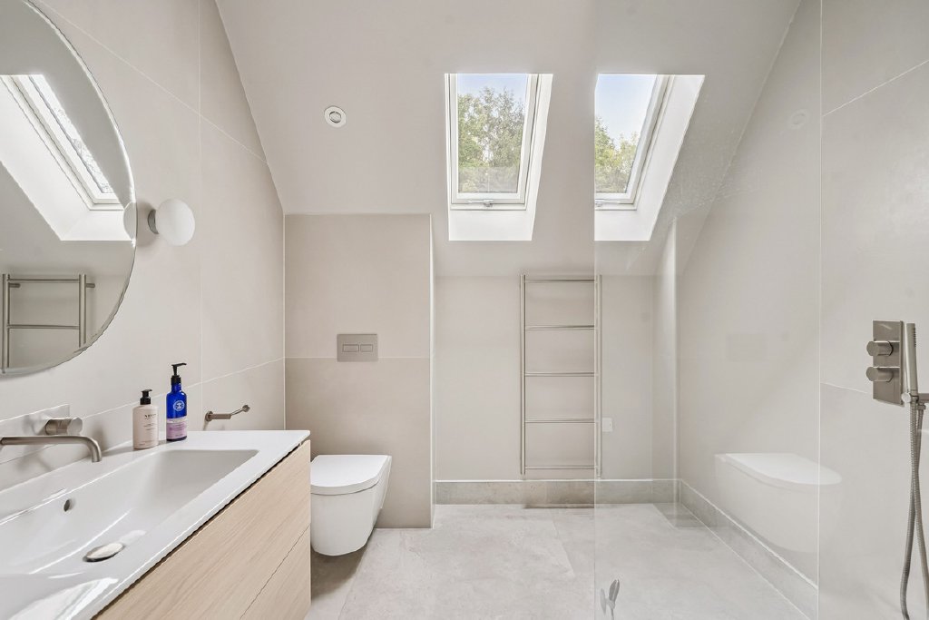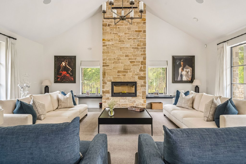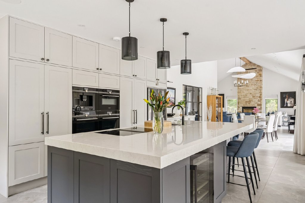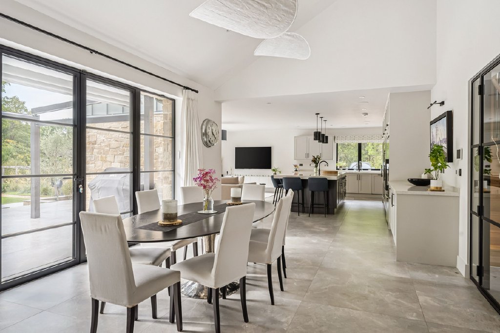 Constructed with a focus on sustainability and aesthetic excellence, the house benefits from high levels of insulation and features striking elevations of natural buff sandstone, Accoya wood cladding, and zinc detailing beneath a traditional slate tiled roof. Expansive double-glazed windows and three sets of wide, south-facing bifold doors invite an abundance of natural light into the principal reception rooms, perfectly complementing the modern interior design while framing picturesque views of the surrounding gardens.