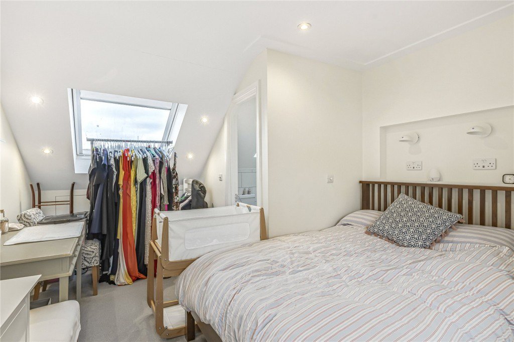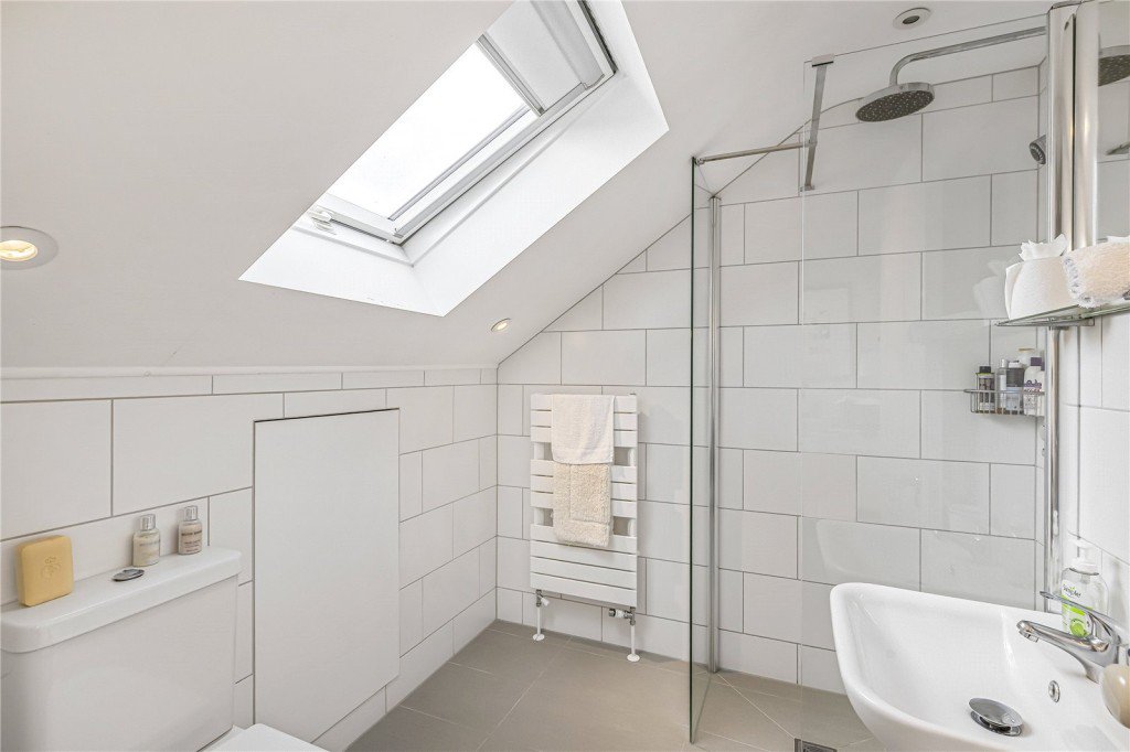 Walk up the stairs to the first floor and there are two bright bedrooms, both with built in storage. The master bedroom is to the front with its own en-suite bathroom and the bedroom to the rear has a separate shower room accessed via the hallway. The third bedroom is on the second floor and has an en-suite shower room and storage into the eaves.