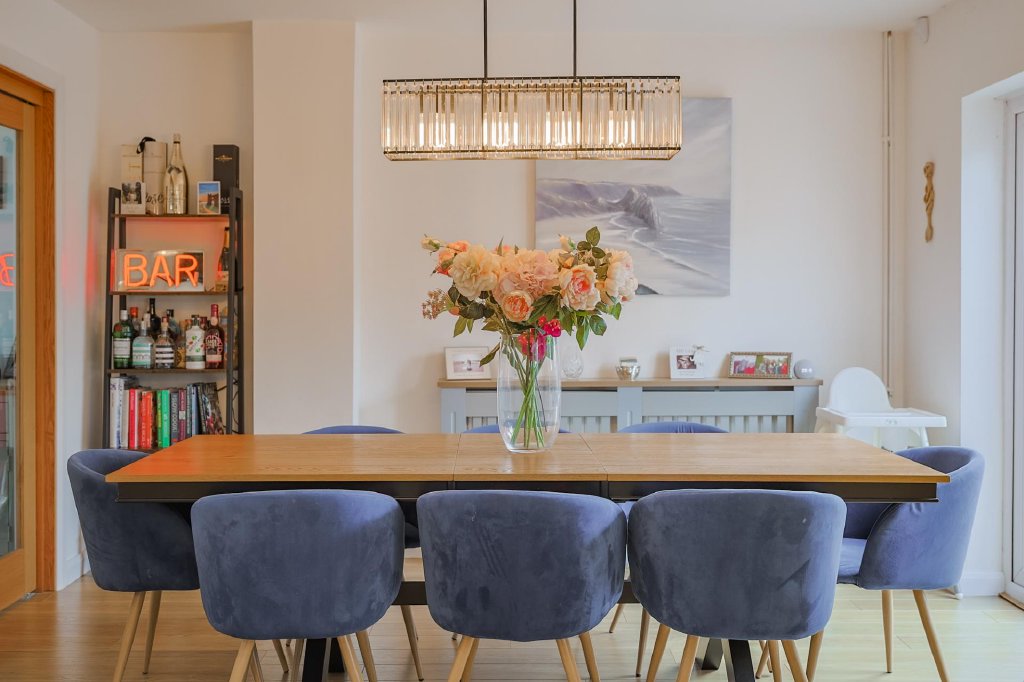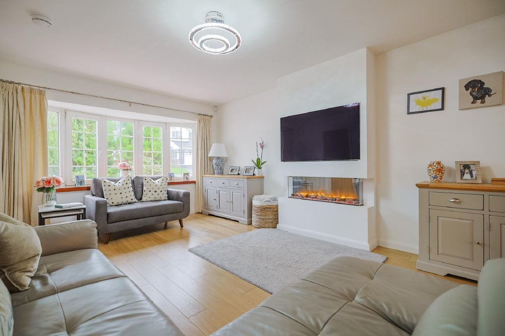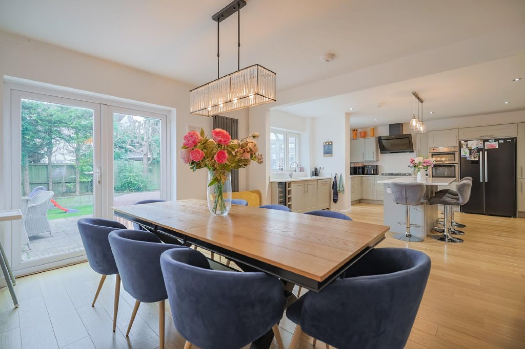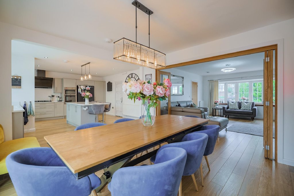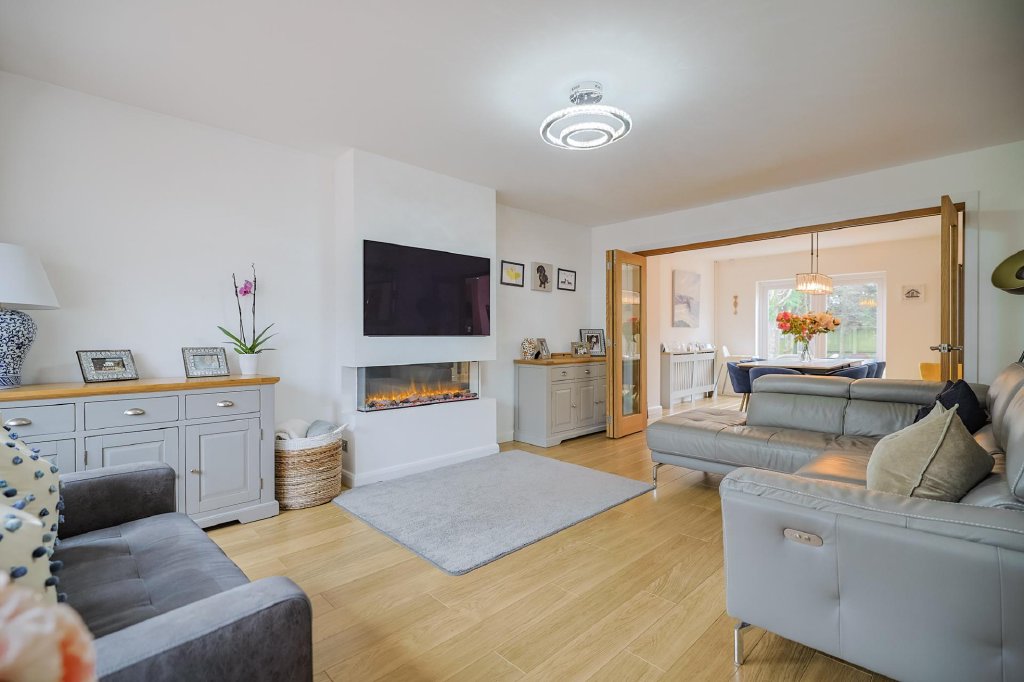A generous lounge filled with natural light thanks to a large bay window overlooking the front aspect. The space features engineered oak flooring, a stylish electric fireplace, and folding doors leading to the open plan kitchen/diner/breakfast room. This flexible arrangement allows you to create either a cosy space or an expansive open-plan entertaining area.