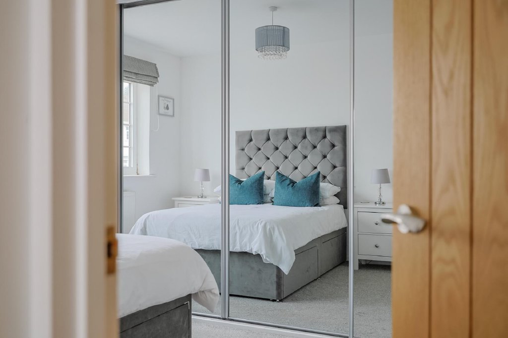 A well-proportioned double room to the front of the property. A large window floods the room with light, while a full wall of fitted sliding door wardrobes with hanging rails provides excellent storage. Finished with carpeted flooring.