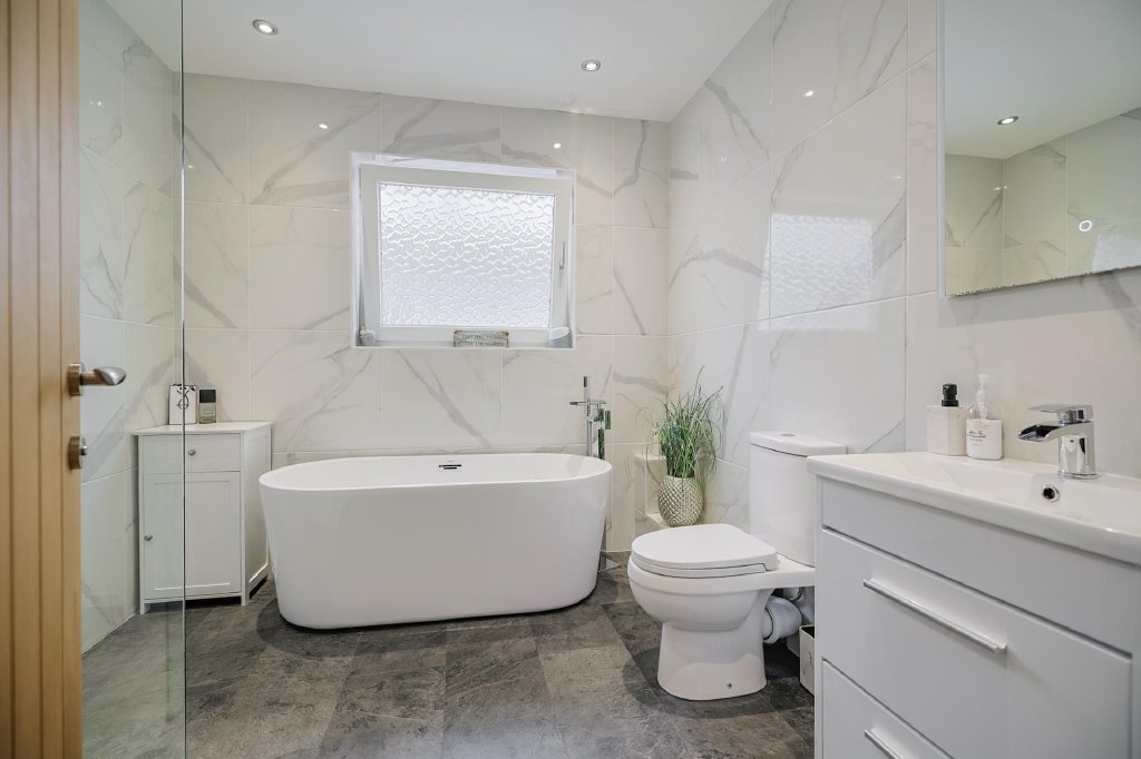 A modern and stylish family bathroom comprising WC, wash basin with storage beneath, a feature Mode bath with freestanding tap and handheld shower head, a walk-in shower, heated towel rail, and a mirror with touch lighting. Vinyl flooring, tiled walls, spotlighting, and a frosted rear window complete the look.