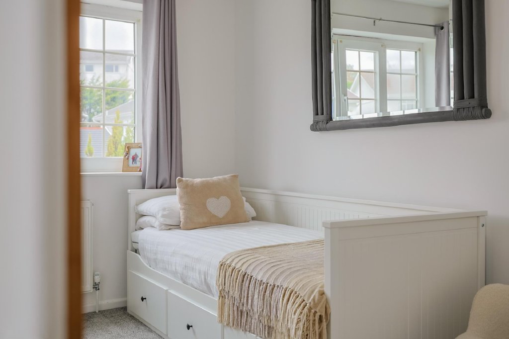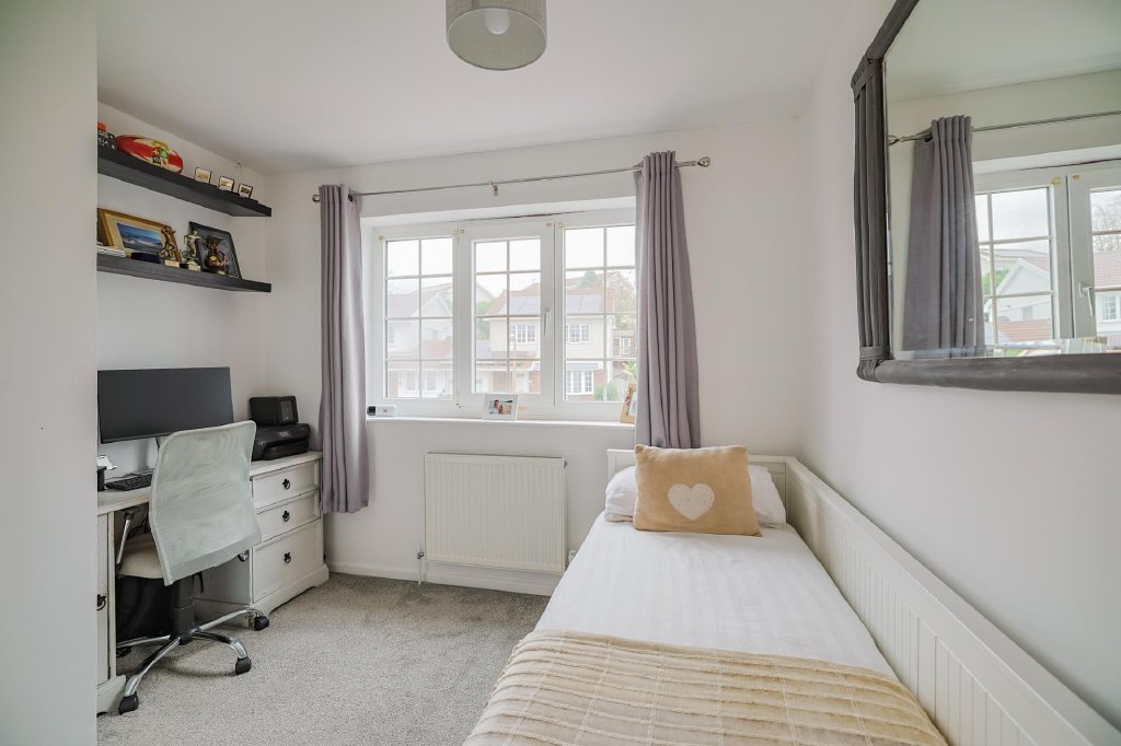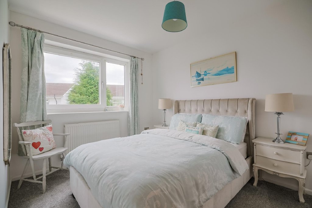 Another bright rear-facing bedroom, enjoying garden views through a generous window.