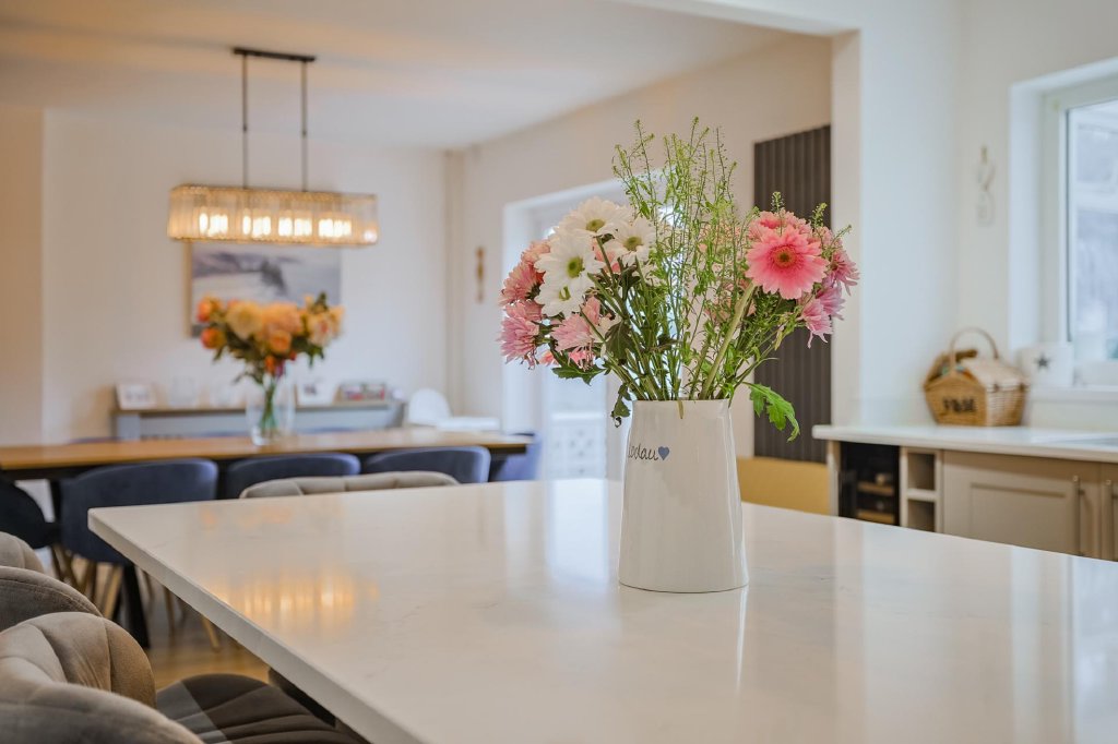 The kitchen island offers further storage, quartz worktops, and a breakfast bar with space for four stools. The area also benefits from a feature radiator, ample dining space, and contemporary spot and feature lighting. A superb social hub, with seamless flow to the garden, conservatory, and integral garage.