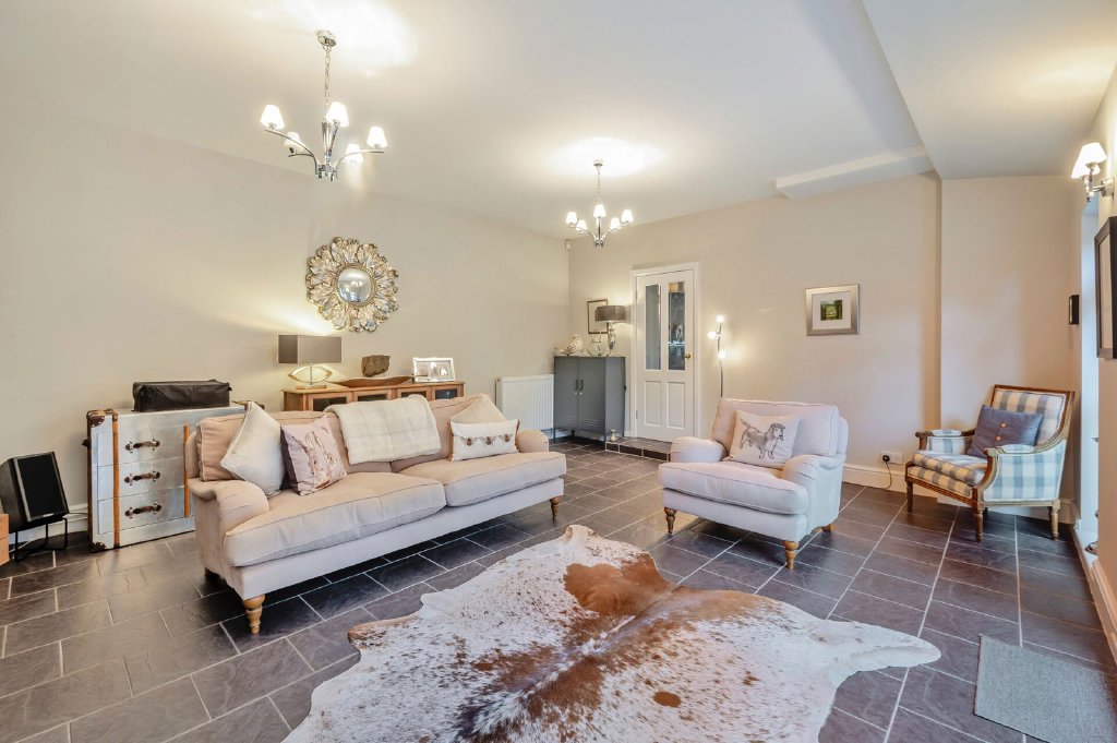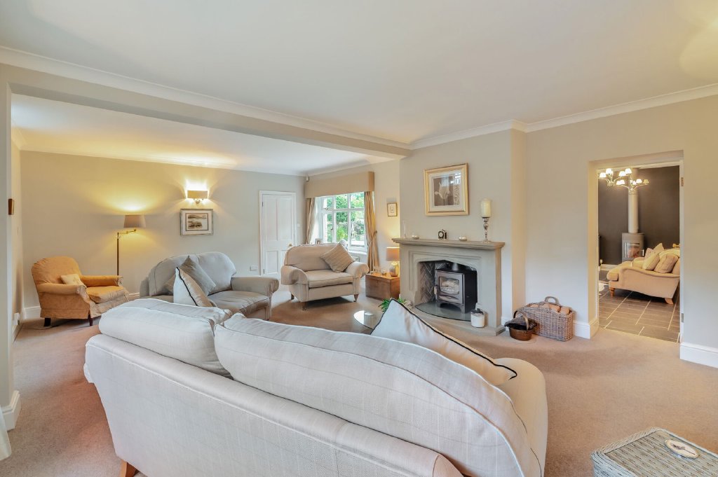 From the sitting room there is access leading seamlessly into a stunning garden room—an elegant extension of the living space and a true sanctuary in every season. A second log burner adds warmth and charm, while full-height glazing offers uninterrupted views across the beautifully landscaped garden.