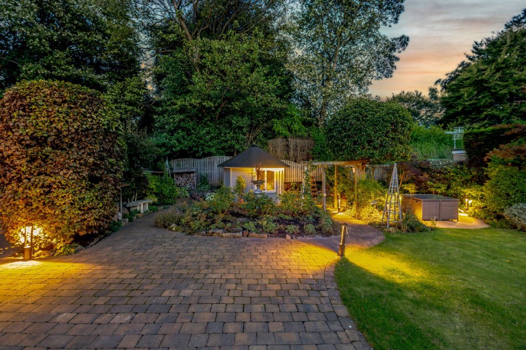 A central lawn is bordered by meandering paved pathways that invite exploration, leading to a series of secluded pockets thoughtfully arranged throughout the garden. One such retreat houses a charming summer house—perfect for quiet afternoons, creative pursuits, or simply soaking in the serenity of the surroundings.