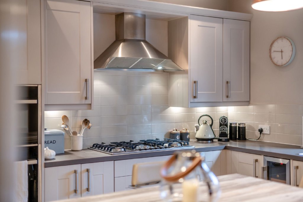 This modern culinary space is designed for both everyday living and entertaining, featuring integrated appliances that sit seamlessly within sleek cabinetry. At its centre, a statement island offers generous preparation space and doubles as a breakfast bar—perfect for casual meals, morning coffee, or gathering with friends while cooking. The open-plan design invites conversation and connection, making it a natural hub for family life. This then leads into a practical utility room, with complementary styling continued from the kitchen.