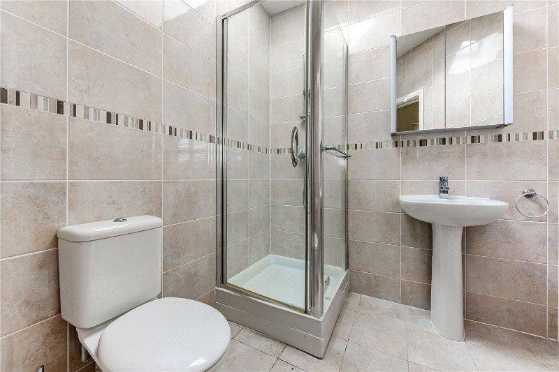 The bright and well-proportioned hallway features hardwood flooring that flows throughout the ground floor. To the right, a convenient cloakroom/WC is finished in neutral tones, while a door opens into the principal reception room – a light-filled space enhanced by French doors leading to the garden. A contemporary log-burning stove provides a stylish focal point, creating a cosy yet refined atmosphere ideal for relaxing or entertaining.