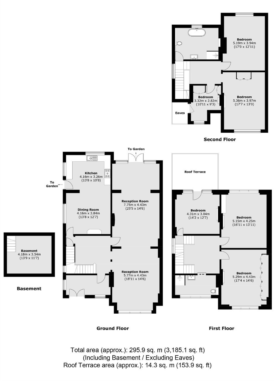 Upstairs are six well-proportioned bedrooms, one with access to a private roof terrace and two stunning bathrooms. The basement offers further potential, subject to permissions.
