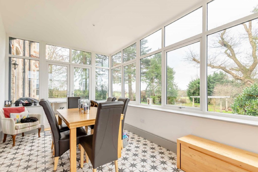 Wander to the end of the kitchen and an intriguing set of French doors open onto a wonderful bonus space - a generous sunroom that is cloaked by garden views on three sides, enticing you to sit and relax and be immersed in nature whatever the weather. But when the sun does start to peep through the clouds, doors can be flung open in joy to offer a seamless route out onto the large garden terrace.