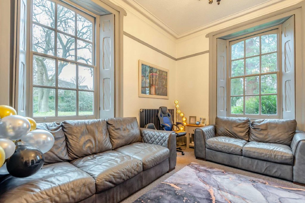 Into the adjacent room and this space is an impressive and sociable drawing room that can welcome a group of family or friends, with space for multiple comfy sofas and armchairs gathered around the log burner easily tempting you to sit, stay and relax.