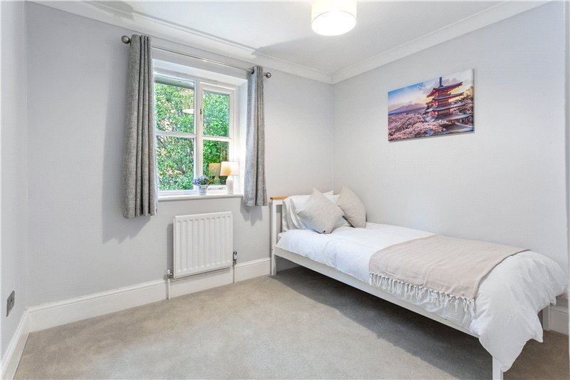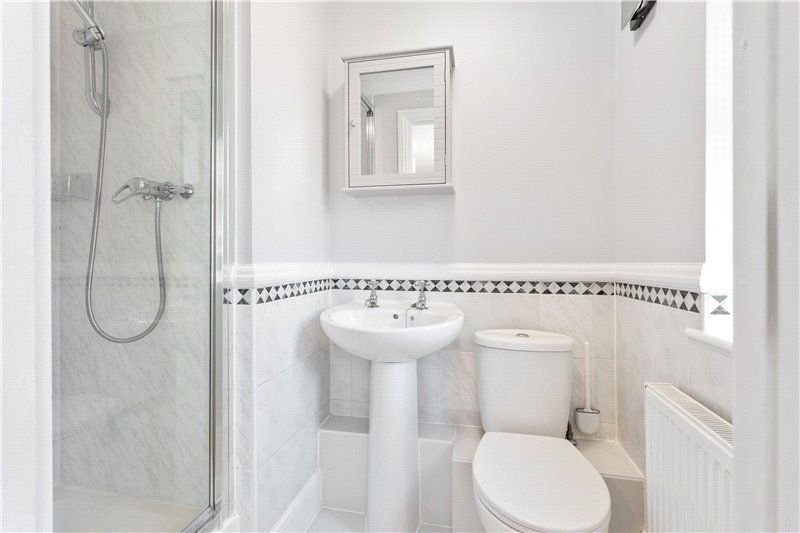 Upstairs, the master bedroom is a bright, spacious room overlooking the mews, complete with fitted wardrobes and an en-suite shower room with walk-in shower, W.C., and sink. Two further double bedrooms overlook the rear garden. The larger bedroom includes built-in wardrobe while both comfortably accommodate a double bed and additional furniture. The bathroom features a bathtub with a new overhead rainfall shower, a vanity unit above a sink and a W.C.