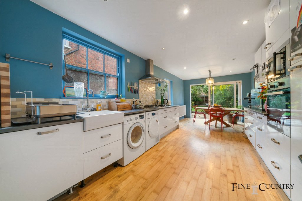 The kitchen has been modernised in sleek grey cabinetry with integrated appliances and crisp white worktops, providing a clean, contemporary counterpoint to the period features elsewhere. Large windows and a door onto the garden fill the space with natural light, while ample room for dining makes it the hub of the home. A guest WC and utility room complete the ground floor.