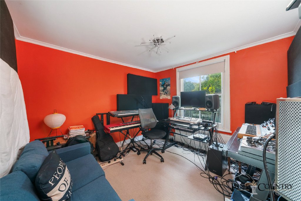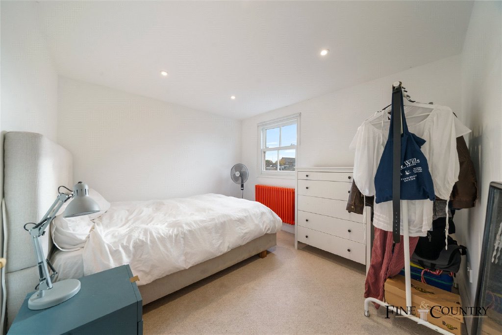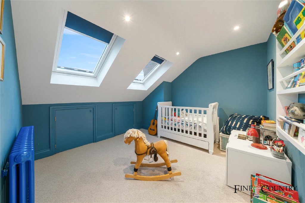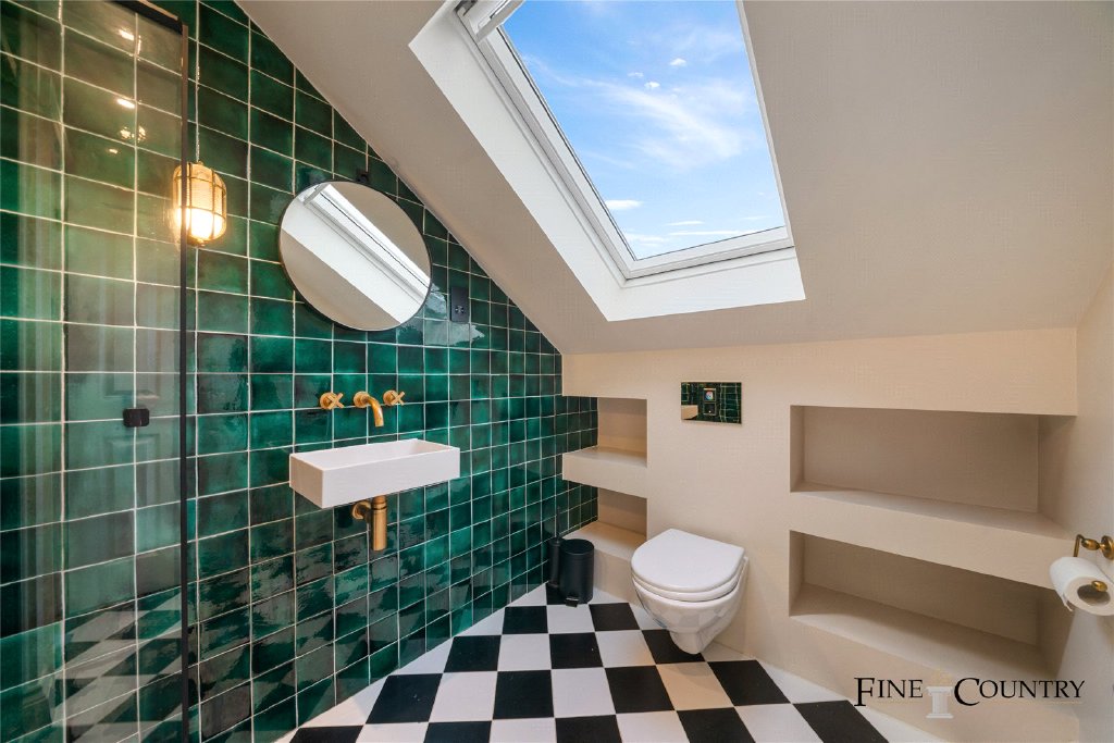 The top floor has been converted into a spacious fifth bedroom with vaulted ceilings, fitted storage, and a stylish en-suite bathroom. Skylights and mirrored wardrobes make this a bright, versatile space suited to a bedroom, studio or guest suite.