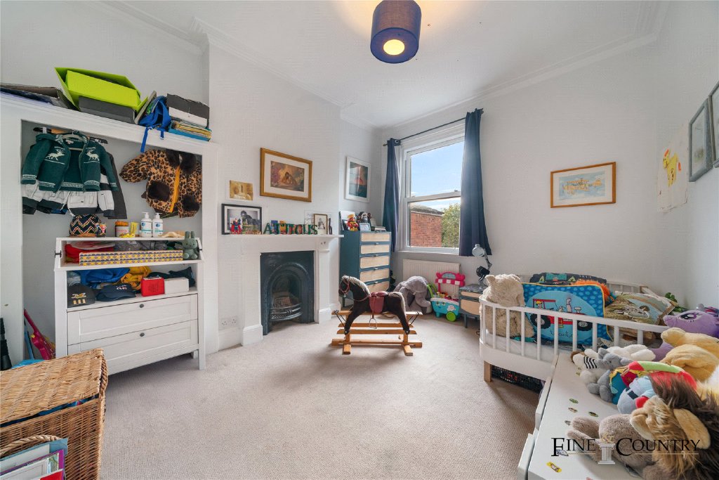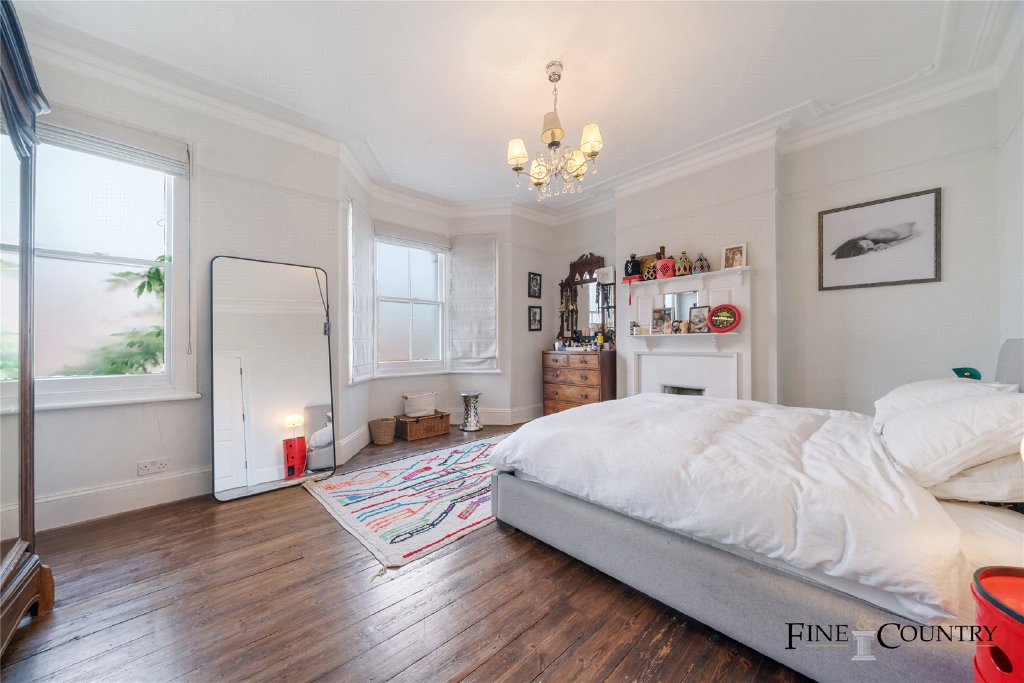 Upstairs, the first-floor hosts four well-proportioned bedrooms. The rear-facing principal bedroom is particularly impressive, capturing soft natural light, benefitting from garden views, and opening onto a private balcony — a serene retreat. High ceilings, refined cornicing, and a grand period fireplace lend the room an unmistakable sense of Victorian sophistication, while its generous proportions provide ample room for seating or dressing areas.