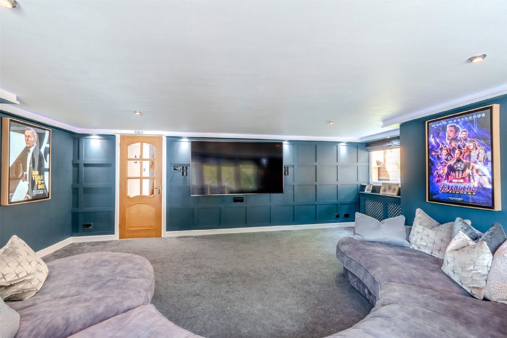 Family Cinema Room 19'7" x 16'2" (5.97m x 4.93m). Double glazed French doors to side with double glazed windows to either side. Carpet. Plain coved ceiling with downlights. Two radiators.