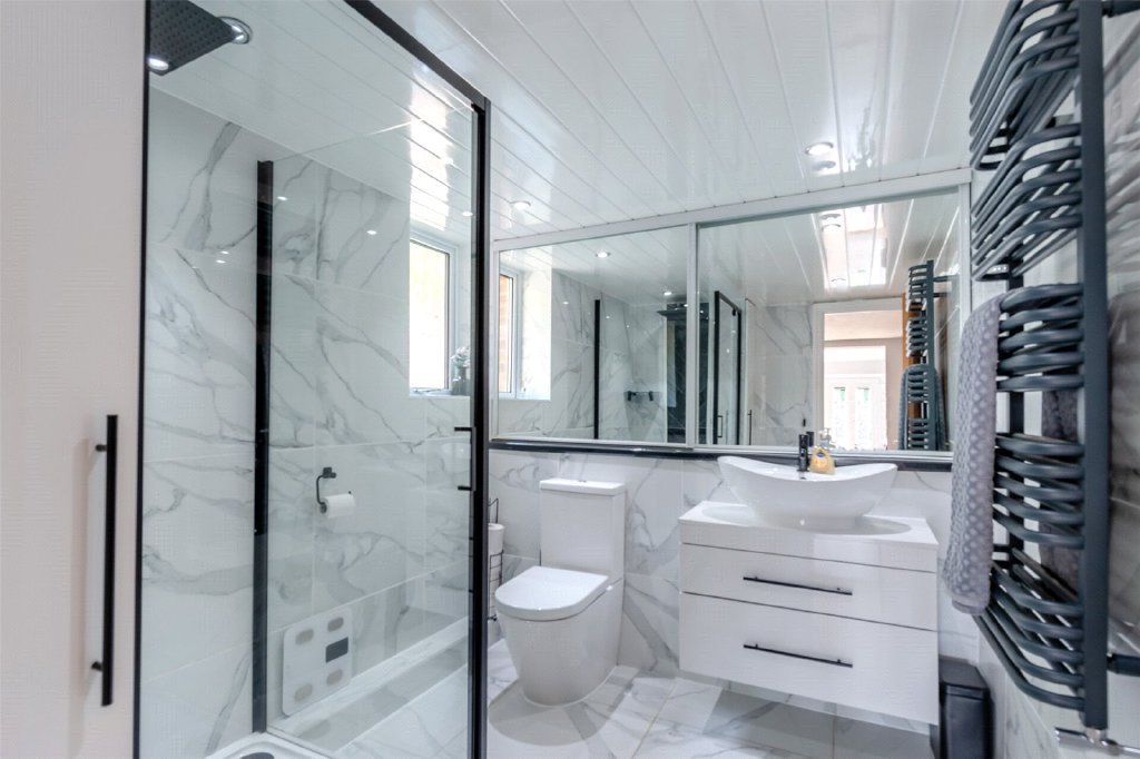 Shower Room 8'3" x 6'11" (2.51m x 2.1m). Double glazed frosted window to side. Panelled ceiling with downlights. Heated towel rail. Tiled flooring. Tiled walls. Double shower unit. Wash hand basin in vanity unit with mixer taps. Low level WC. Mirrored cabinet housing boiler.