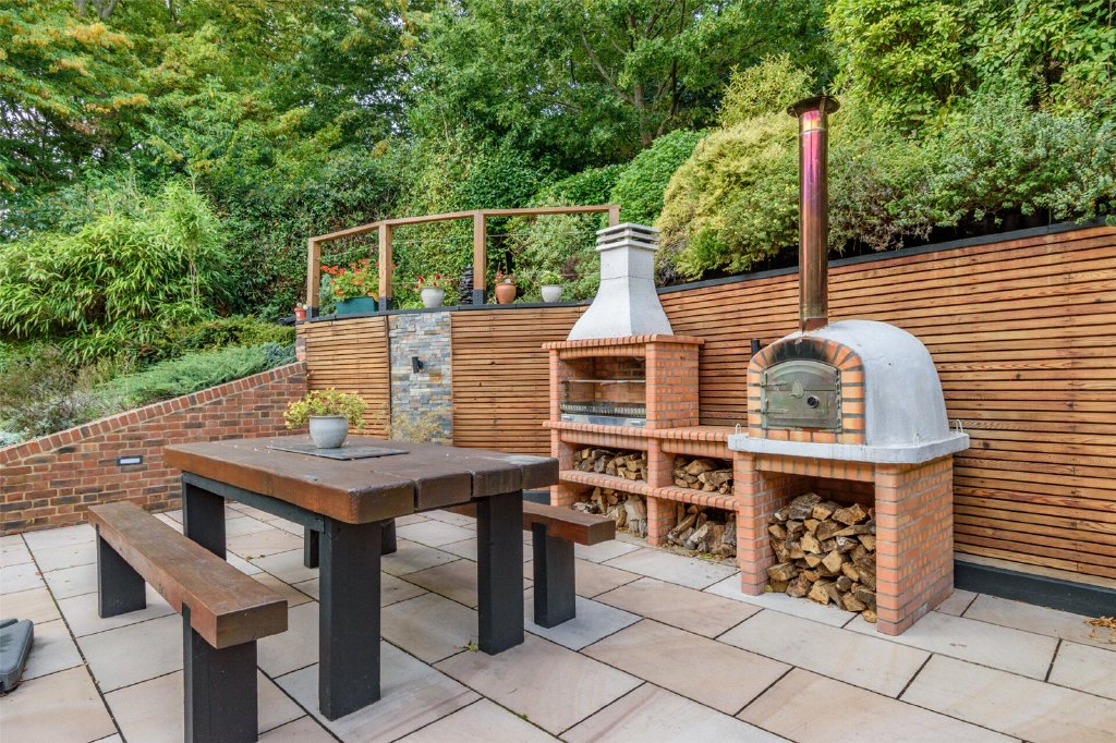 Rear Tiered Garden Lower tier - Indian sandstone split level patio area. Entertaining/kitchen area. Brick built barbecue and pizza oven. Panelled and lit garden features. Two water supplies. External power.