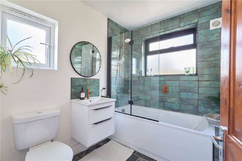 On the first floor, the landing leads to three well-sized bedrooms. The master bedroom benefits from a front-facing bay window, while the second and third rooms provide flexible accommodation for family, guests, or home working. The family bathroom has been recently updated with a stylish, contemporary finish, featuring bold green tiling, a modern vanity unit, and a shower over the bath with a glazed screen.