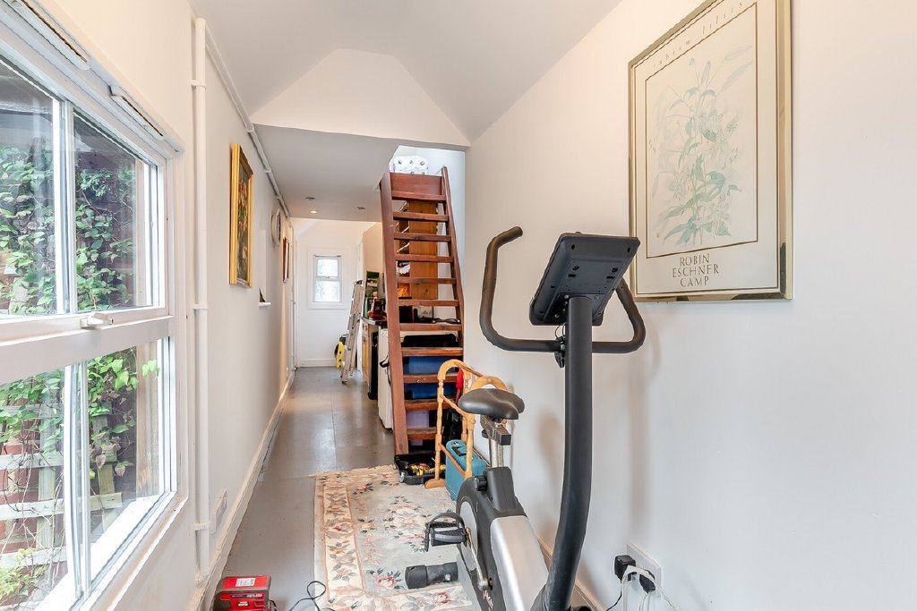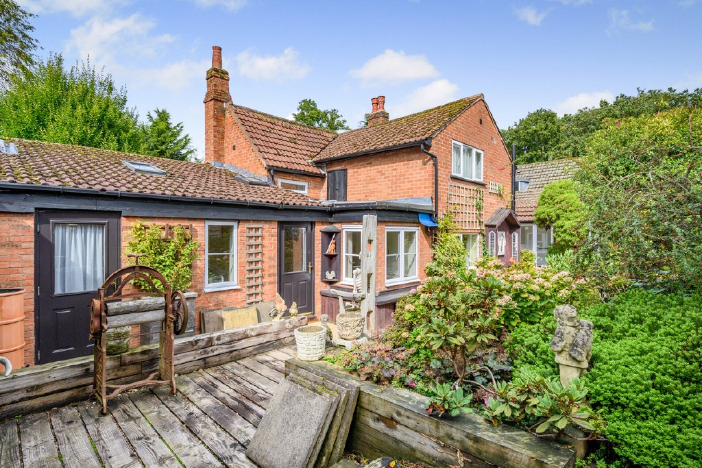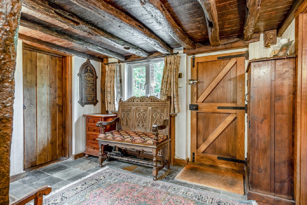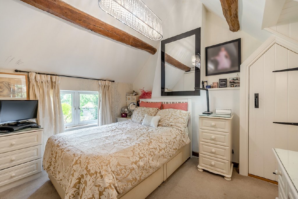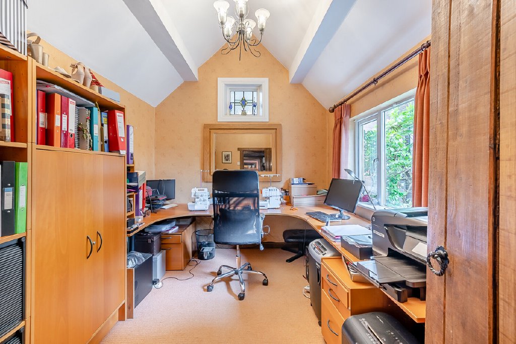 Inside, the cottage unfolds like a Tardis—full of character and far more spacious than it first appears. The welcoming entrance hall features a striking staircase and leads to multiple ground-floor living spaces. These include a cosy sitting room with an inset fire, a dual-aspect lounge with vaulted ceilings and a feature fireplace, and a second reception room with bespoke bookcases and character beams. A well-proportioned office provides ideal working-from-home space or the potential for a fourth bedroom.