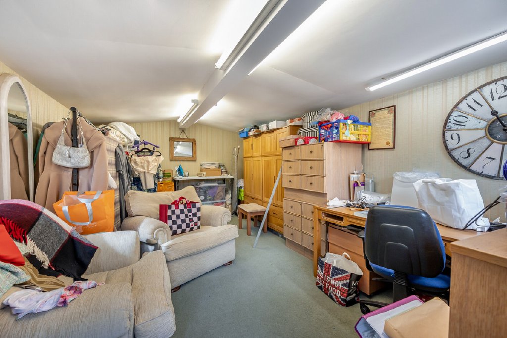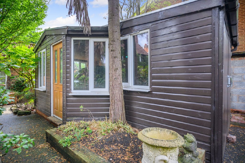 To the rear, the landscaped garden provides a wonderful setting for both relaxation and entertaining, with a large patio, raised planting beds, and a charming built-in BBQ area. A timber-clad garden room, or “man cave,” offers an electrified space perfect for hobbies, relaxation, or additional office use.