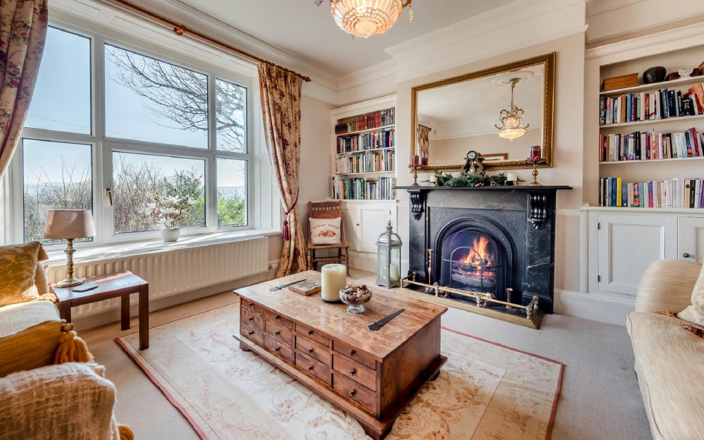 To the rear, the everyday entrance opens into a useful porch area, complete with a WC and a generous utility room that houses the oil-fired boiler and provides ample space for laundry appliances. The main living room spans the full depth of the house, offering a wonderful sense of space, with high ceilings, elegant period detailing, and traditional fireplaces with built-in alcove storage. Both main reception rooms are bathed in natural light from large windows that frame beautiful views across the gardens to the mountains beyond.