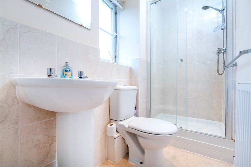 with frosted UPVC window to the front aspect, comprising a modern three-piece suite, low level WC, pedestal wash hand basin and oversize shower cubicle with shower over, tiled splash backs, radiator, extractor fan and ceiling spotlights