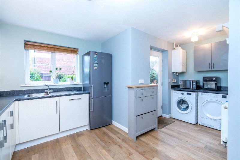 With part glazed door to the rear aspect, eye level storage unit, wall mounted boiler, plumbing and space for washing machine, space for tumble dryer, radiator, power points and modern wood effect flooring.