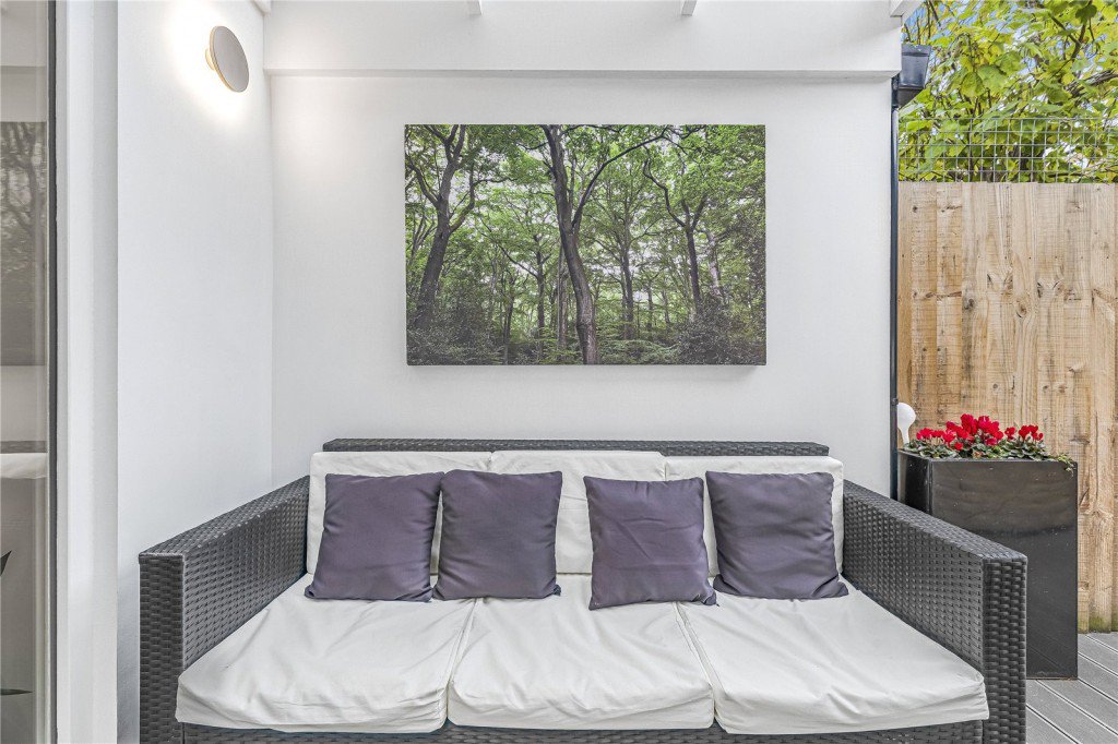 The property offers a spacious reception room with a separate modern kitchen, double doors open out to a covered patio area with seating which leads to a pretty and low maintenance patio. The first floor consists of a south facing principle bedroom with ample storage, a smart family bathroom with bathtub and overhead shower and a separate study/ bedroom. The top floor consists of a further double bedroom with built-in storage with a private w.c.