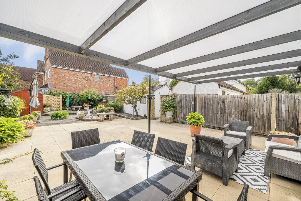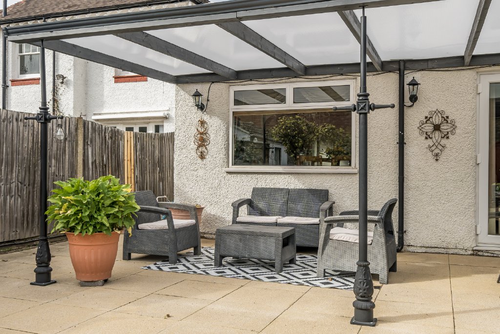 The exterior of the property features a gated front garden adorned with low-maintenance artificial grass, providing a neat and attractive appearance. Gated side access leads you to the rear garden, which enjoys a favourable south-facing aspect. This outdoor space predominantly features paved areas, while also including a lush, laid-to-lawn section and a sheltered area for relaxation, allowing you to enjoy the outdoors in any season.