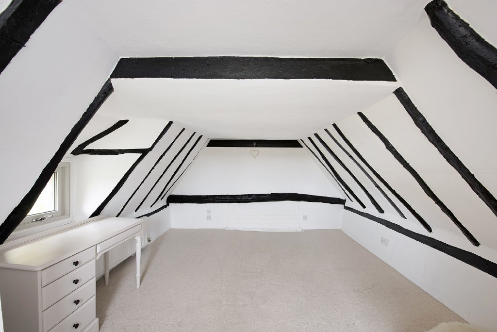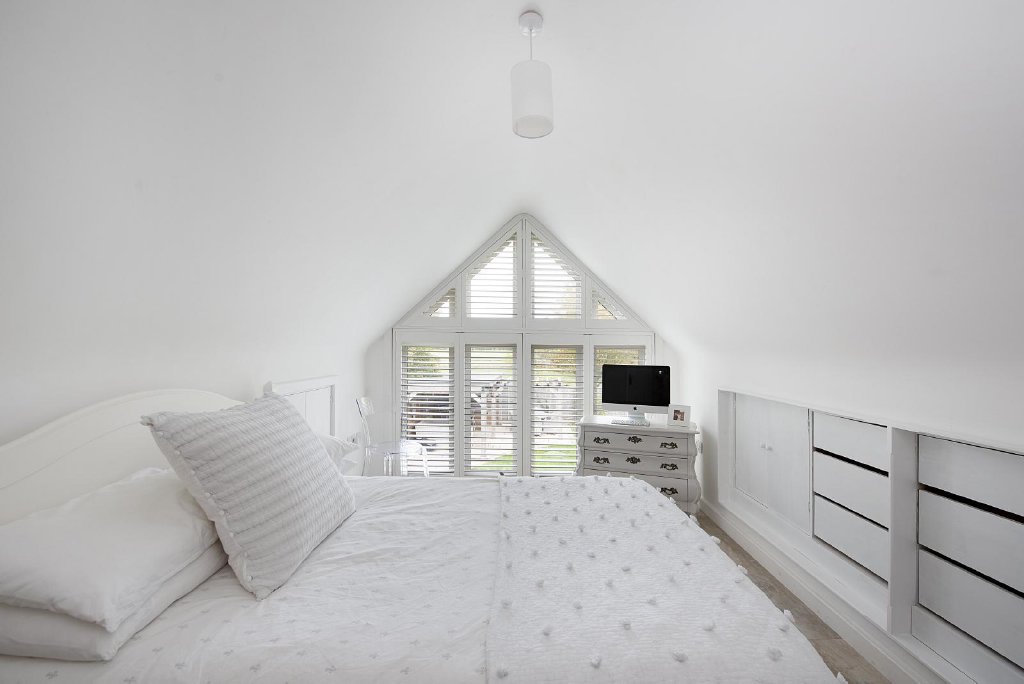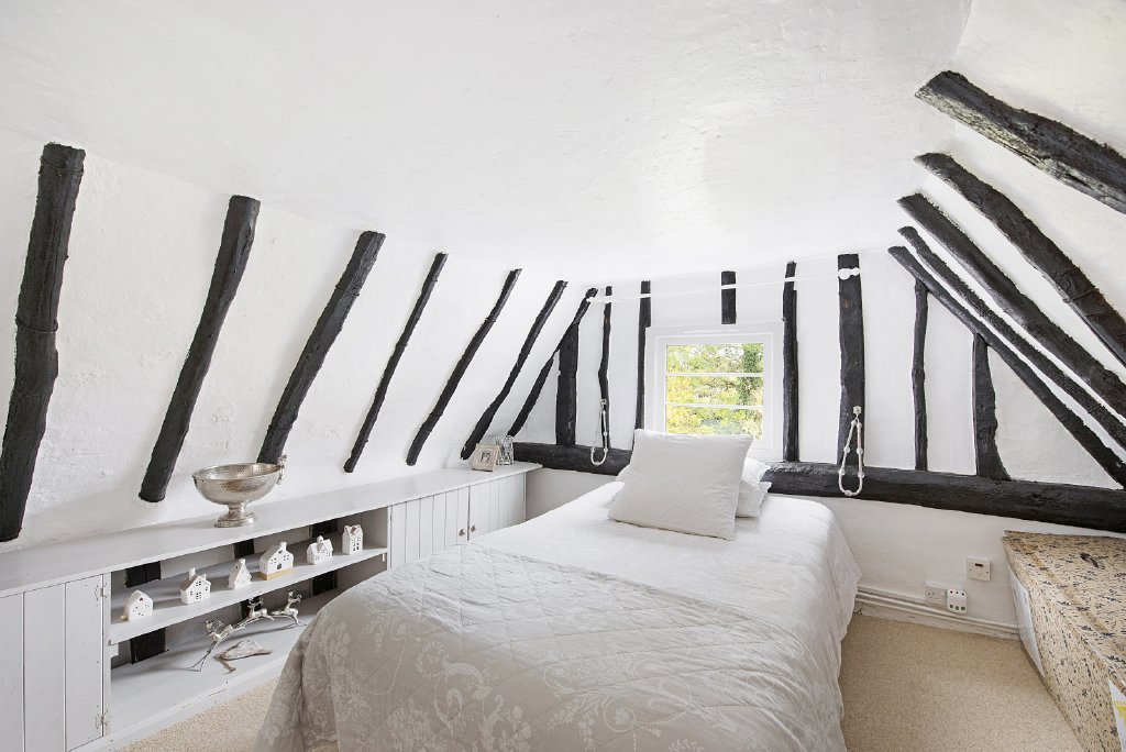 The master bedroom is on the ground floor, and the owners have loved the fact that if you wake early, on summer mornings, you can open the French doors to let in the warm morning air and listen to the birdsong. They also describe the charm of the light flooded bedroom under the gable roof and its view onto the garden.