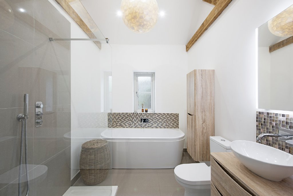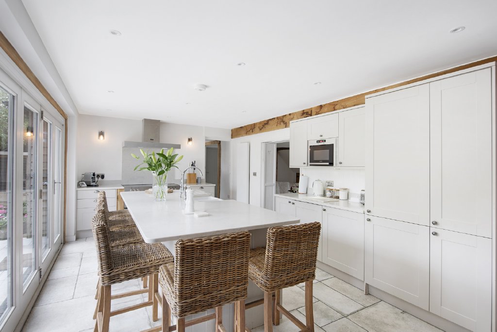 At the heart of the home lies the open-plan kitchen and breakfast room, a striking contemporary space blending modern craftsmanship with rustic character. Featuring a central island with twin sinks, integrated appliances, and bi-fold doors that open onto the landscaped rear garden, this space is perfect for everyday living and social occasions alike.