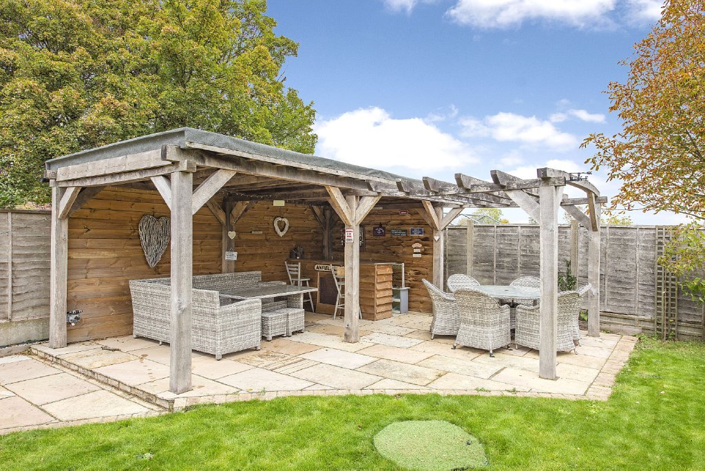 The rear garden is a delightful private retreat, thoughtfully landscaped to create distinct zones for relaxation and entertaining. A paved terrace flows from the kitchen, perfect for al fresco dining, leading onto a manicured lawn bordered by mature planting and fencing. A covered entertaining area provides an ideal space for year-round enjoyment, while a detached garage with double doors and a personal side entrance offers excellent storage or workshop potential. Ample driveway parking is available for several vehicles.