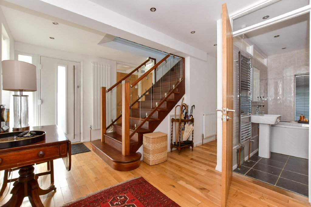 Approached via a private driveway providing ample parking for vehicles and boat storage, this impressive property also benefits from a detached, pitched-roof garage. The home’s sense of quality and style becomes evident the moment you step inside. A striking glazed staircase leads to the first-floor living accommodation, where a stunning open-plan layout showcases the true heart of the home.