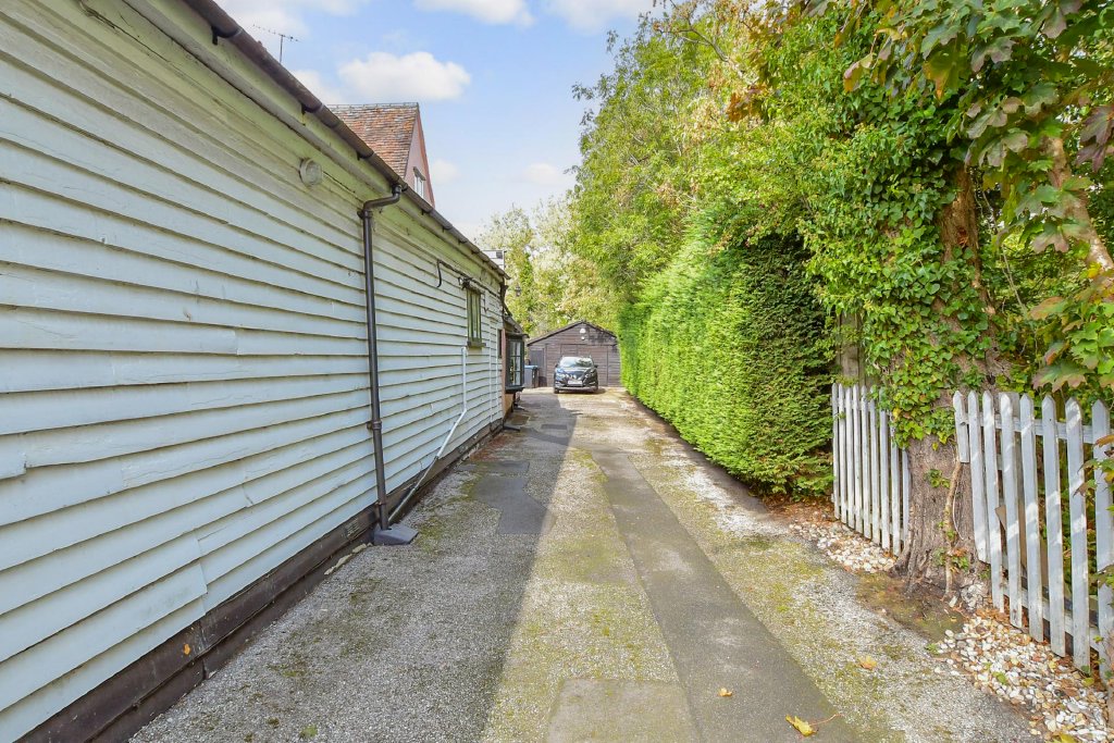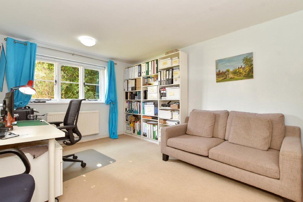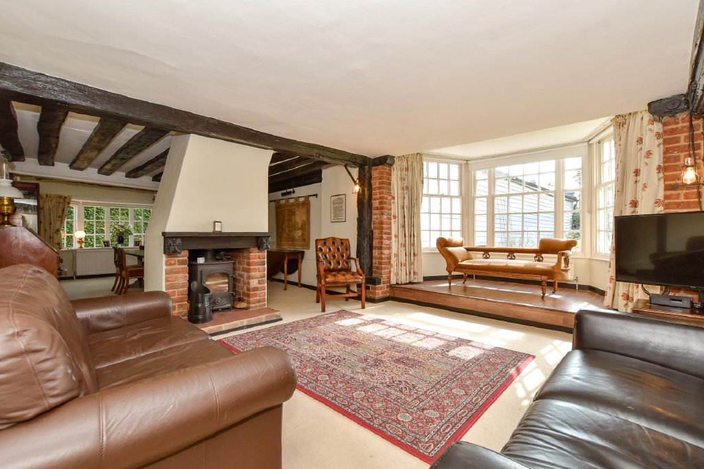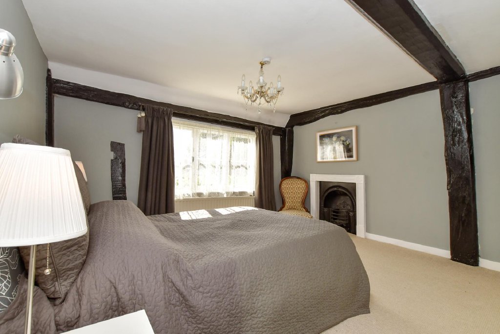 There is a good-sized lounge with fitted bookshelves, exposed wall beams, while the fabulous dual aspect dining and sitting areas have fascinating features wherever you look. They include the impressive, beamed ceiling over the dining area, the central fireplace with its log burner that partially divides the areas and the large multi-pane bay window overlooking the front lawn. This floor also includes a bathroom and a study with fitted shelving. Beside this is a separate staircase to the newer bedroom one, which has an en-suite shower room.