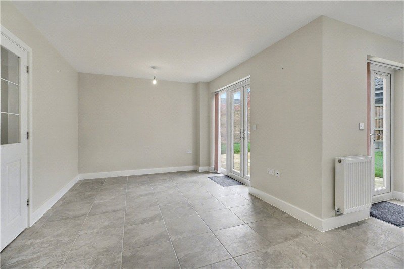 The open-plan kitchen and dining room sits to the rear and truly forms the heart of the home. Flooded with natural light from two sets of French doors, it’s ideal for everyday family living and gatherings alike. The kitchen is fitted with a generous range of units, sleek worktops, an integrated oven, hob, and extractor, along with ample space for a family dining table. A separate utility room offers additional practicality and outside access.