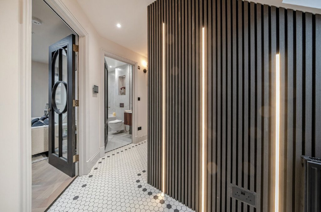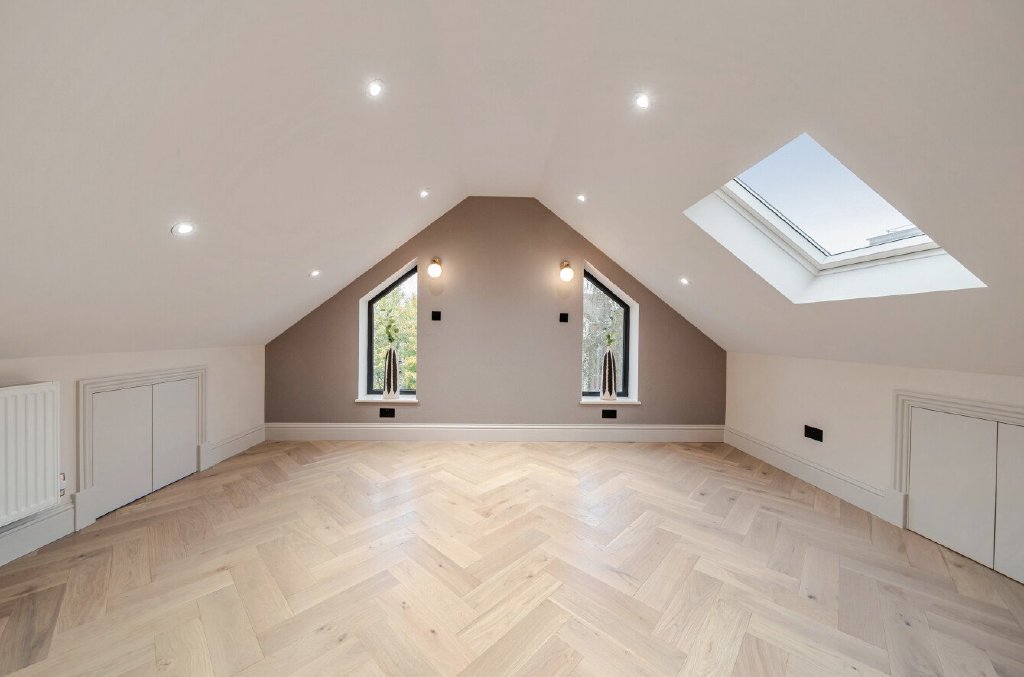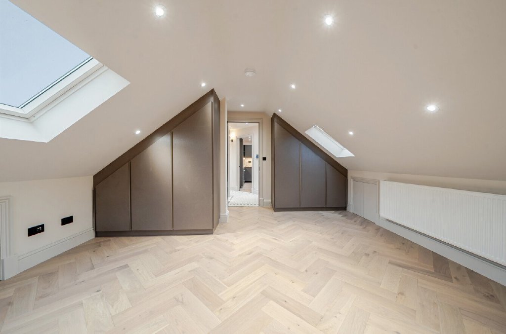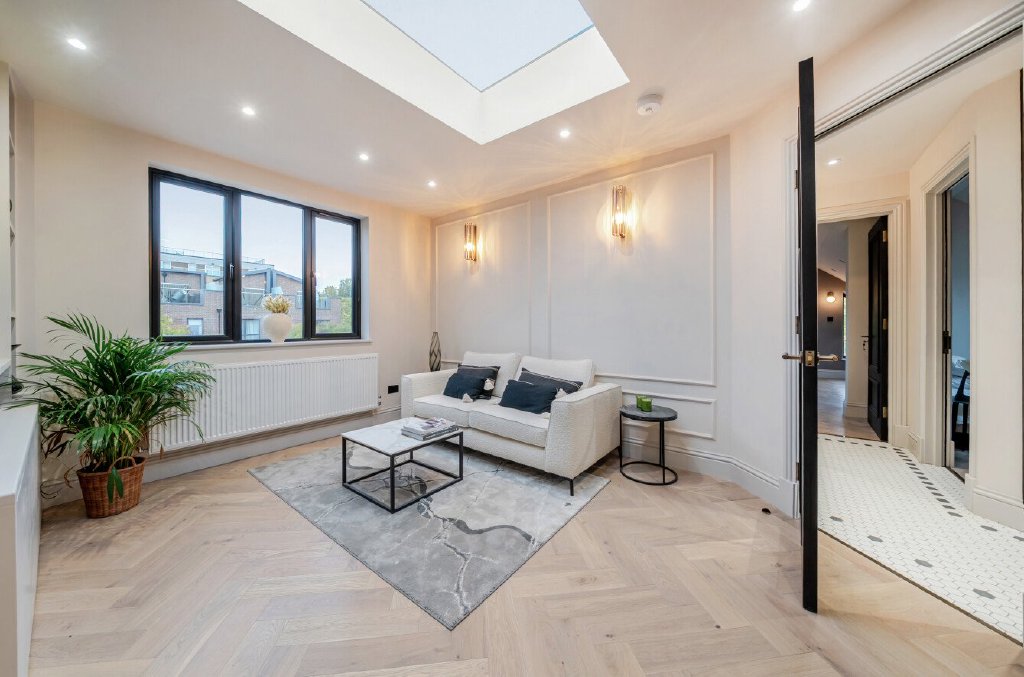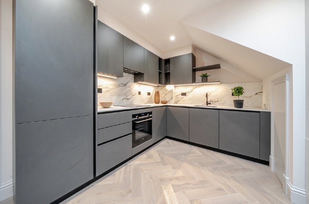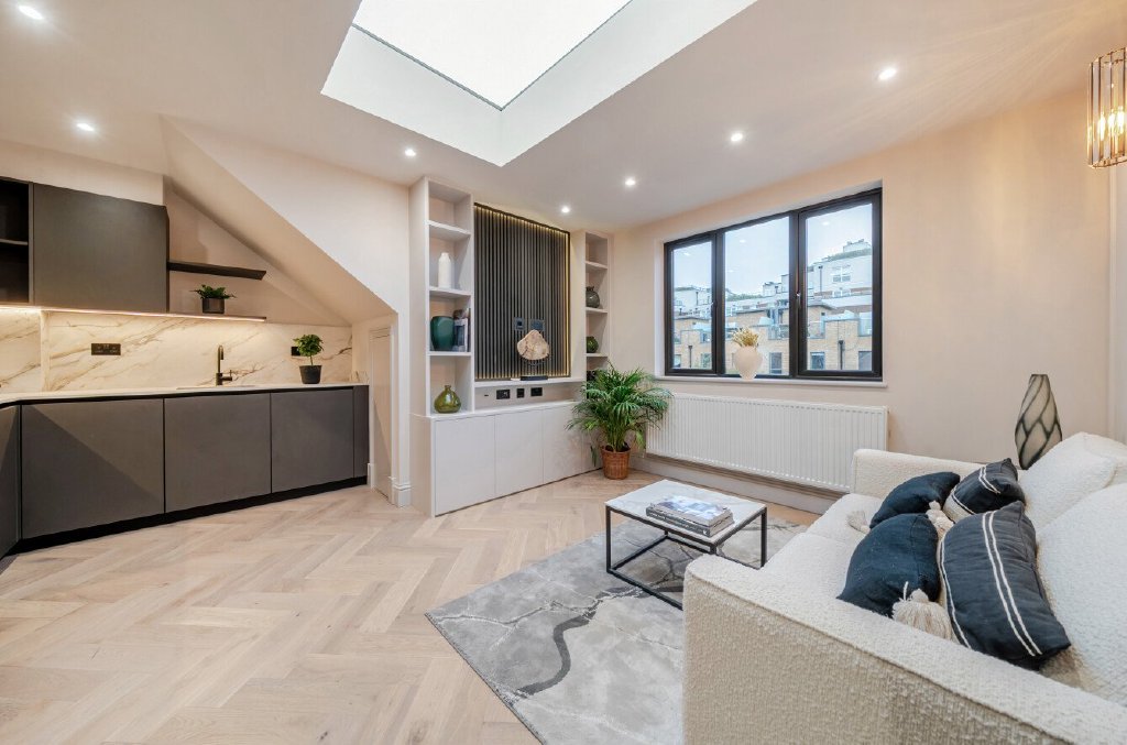 This beautifully presented apartment combines modern sophistication with bespoke craftsmanship, nestled in a peaceful yet highly desirable location. Designed with attention to detail, the home features an elegant Italian kitchen complete with quartz worktops, herringbone-patterned oak flooring, and tailor-made wardrobes.