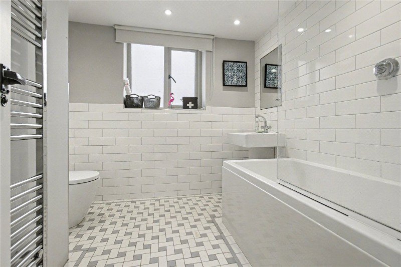 The family bathroom is finished in a classic style, complete with a panel-enclosed bath, pedestal basin, and WC.
