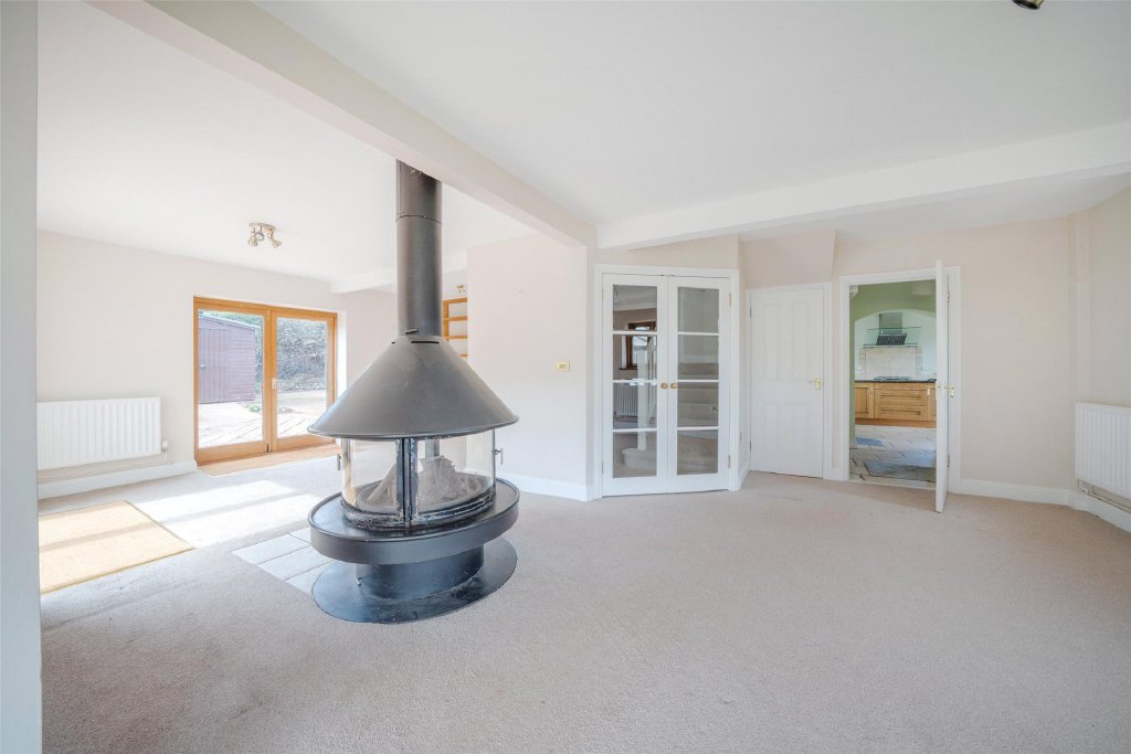 The open plan sitting/dining room is the heart of the home — a superb triple aspect room with wonderful light, fitted bookshelves, and a central woodburner creating a warm focal point. Two sets of French doors open directly onto the garden terrace, capturing glorious countryside views.