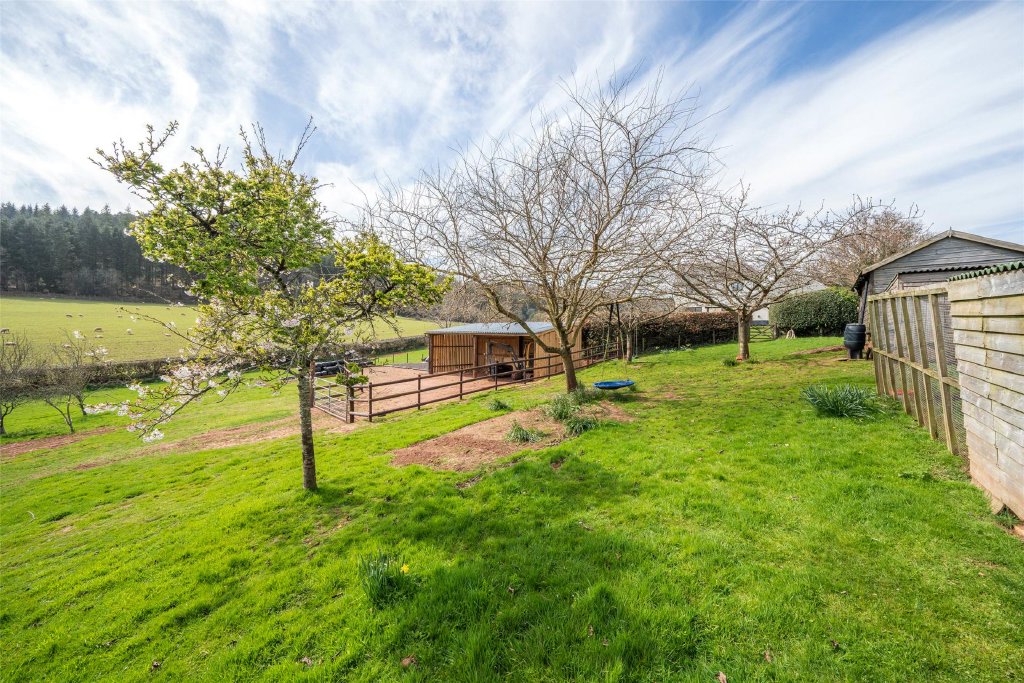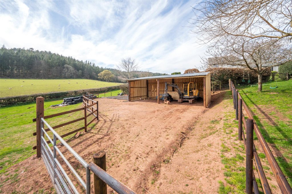 A paved sun terrace sits directly beyond the sitting/dining room — the perfect spot for al fresco entertaining while enjoying the far-reaching views towards Dunkery. Beyond, the land includes two paddocks with water troughs, a stable (14’6” x 9’3”), an open-fronted barn (30’ x 18’7”), and a small copse, all with access to adjoining lanes and riding routes across Exmoor.