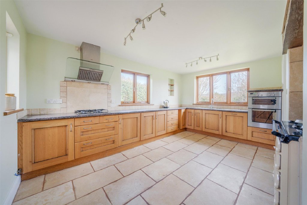 The kitchen/breakfast room enjoys dual aspects over the gardens and is fitted with a range of modern units with ample work surfaces, stainless steel sink, and tiled splashbacks. The oil-fired AGA provides both cooking and hot water, complemented by an LPG hob, Bosch dishwasher, eye-level oven and extractor. A charming stable door opens to the garden, and a large walk-in larder adds practicality and storage.