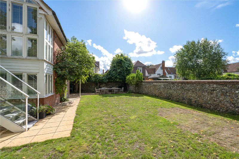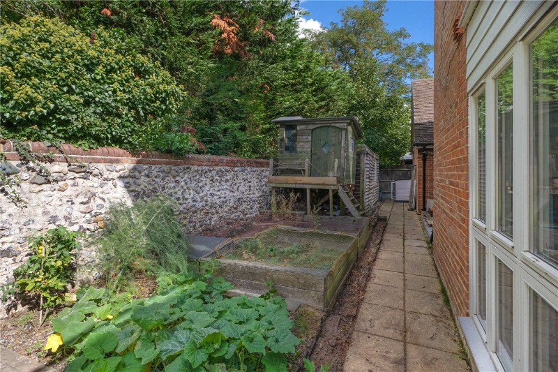 The garden is surrounded by Victorian flint walls. It is mainly laid to lawn with two paved patio areas; one is under cover of the first-floor balcony. To the side is a large tool shed/workshop, and a vegetable patch.