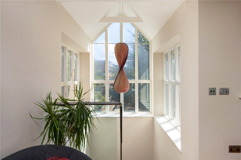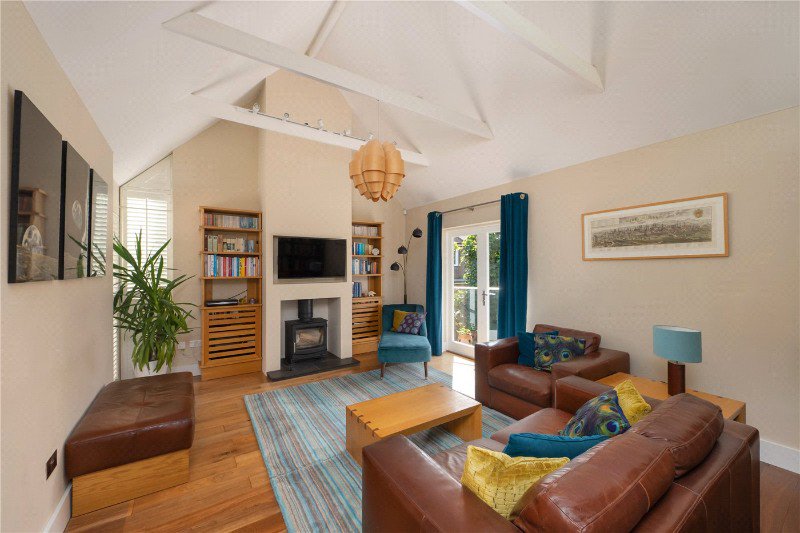 There is a spacious double-aspect dining area, which leads to a large family living room with a Juliet balcony, and log burner; part of this room has been segregated with a removeable bookcase to provide a reading area with floor to ceiling corner window, its own integrated fireplace and double French doors providing access to the main balcony.