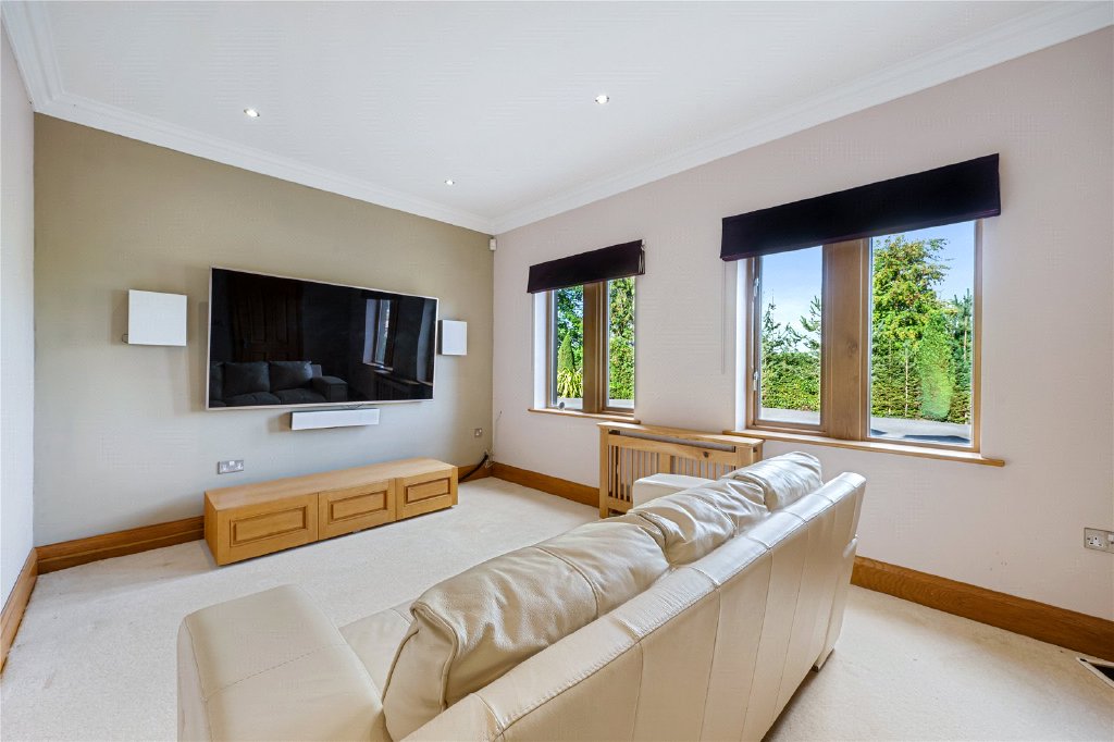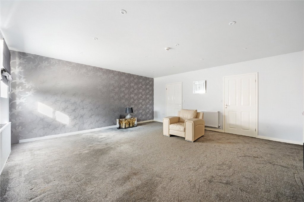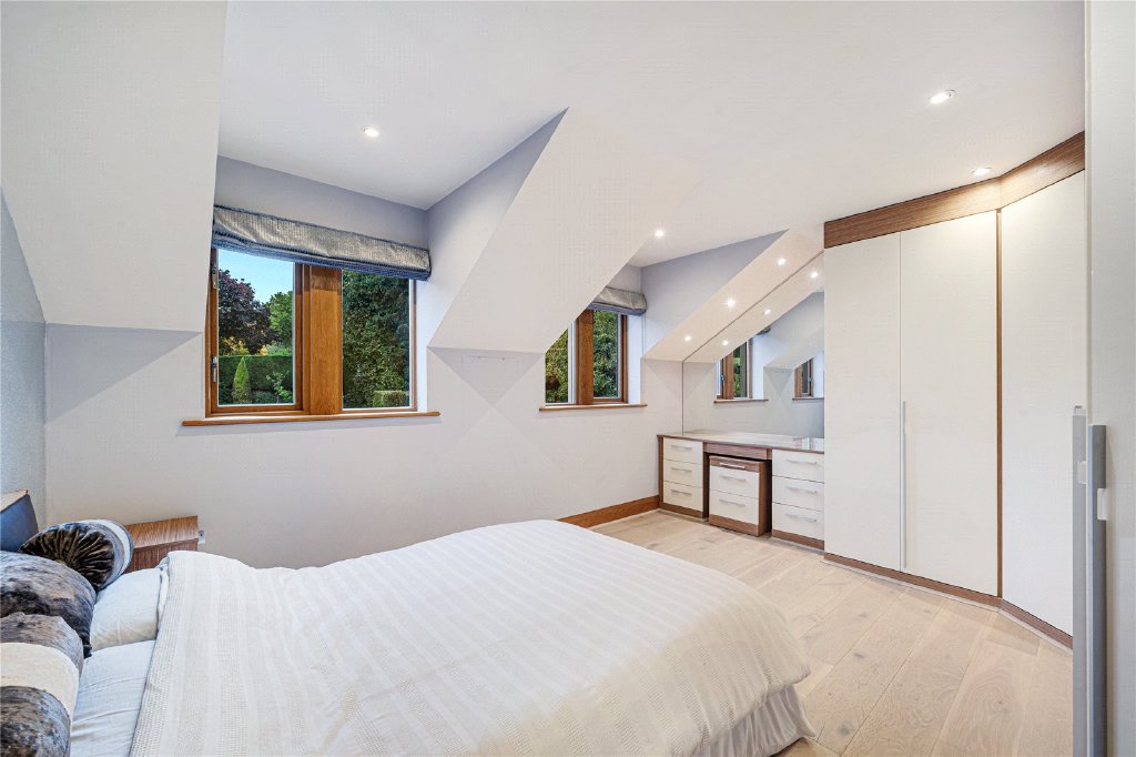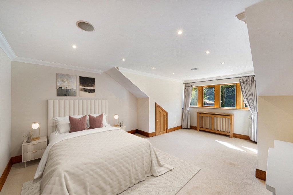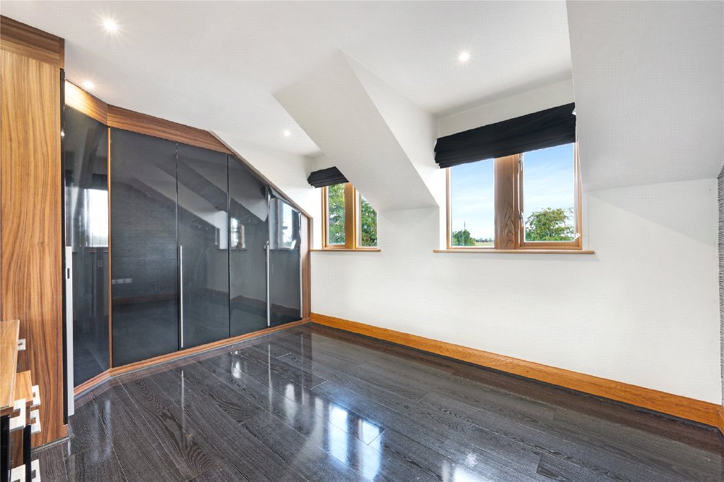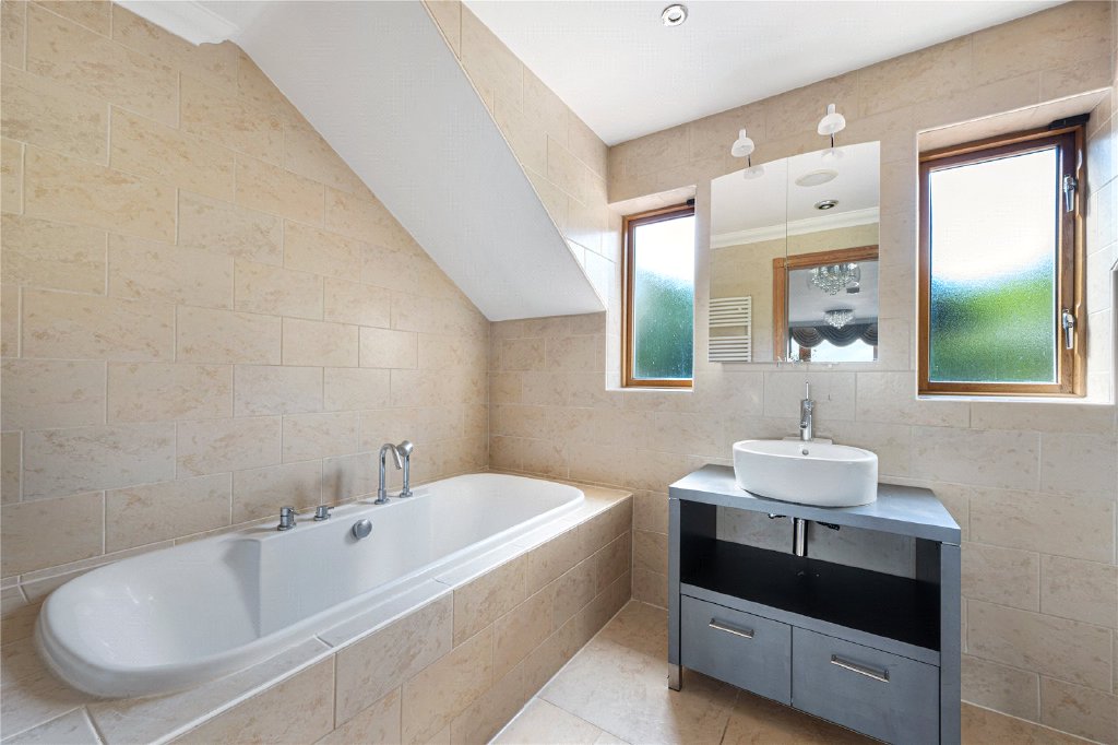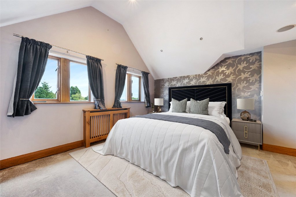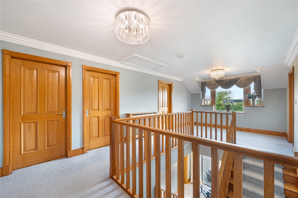 Upstairs, the galleried landing leads to five well-proportioned bedrooms. The principal suite enjoys far-reaching views through a large picture window, as well as a luxurious en-suite shower room and a generous walk-in wardrobe. A second double bedroom also benefits from a modern en-suite, while the remaining three bedrooms all have fitted wardrobes and are served by a stylish family bathroom featuring a freestanding bathtub, walk-in shower, and fully tiled walls.