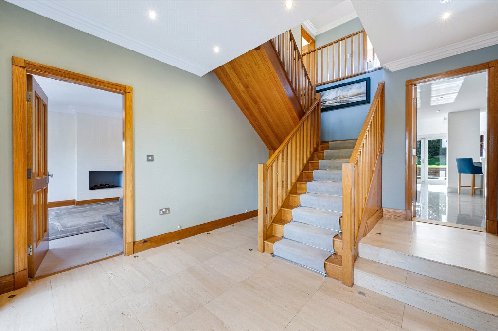 Upon entering, you are welcomed by a spacious and light-filled reception hall, where a solid oak return staircase rises to the first floor. Underfloor heating, tiled flooring, inset floor lighting, and a guest WC set the tone for the high specification found throughout the home. The heart of the property is an impressive open-plan living kitchen, designed by Jeremy Wood Interiors, featuring a large Italian marble island, high-quality solid wood cabinetry, and granite work surfaces. Integrated appliances include multiple ovens, a steam oven, a microwave, an induction hob, a champagne sink, and a secondary sink, as well as built-in fridge freezers and dishwashers. This magnificent kitchen flows effortlessly into a family seating area with French doors that open onto the rear patio and gardens, creating a perfect space for both relaxed living and entertaining.