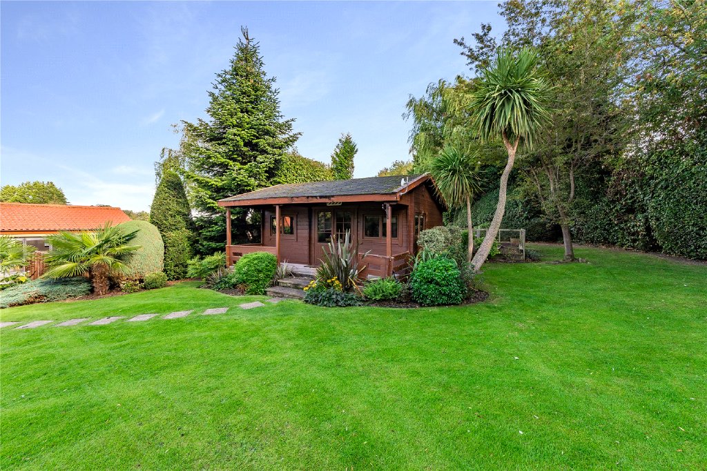 Externally, Lowfield Farm is approached through electric gates which open onto a sweeping driveway and turning circle, complete with a water fountain/pond and ample parking for multiple vehicles. To the rear, the property boasts a beautifully landscaped, south-facing garden which offers total privacy and is a true highlight of the home. An extensive stone-paved patio, accessible from the kitchen, dining room, and the family living room, creates the perfect setting for al fresco dining and summer entertaining. A purpose-built area has space for a hot tub, while steps lead up to a manicured lawn surrounded by mature trees, shrubs, and vibrant planting. Nestled within the garden is a timber-built summerhouse complete with a fully functioning bar, air conditioning, lighting, power, and water—an ideal space for year-round enjoyment. There is also a wooden gazebo, ideal for a peaceful reading spot. A vegetable garden lies to the rear, filled with a variety of home-grown fruit and vegetable beds.