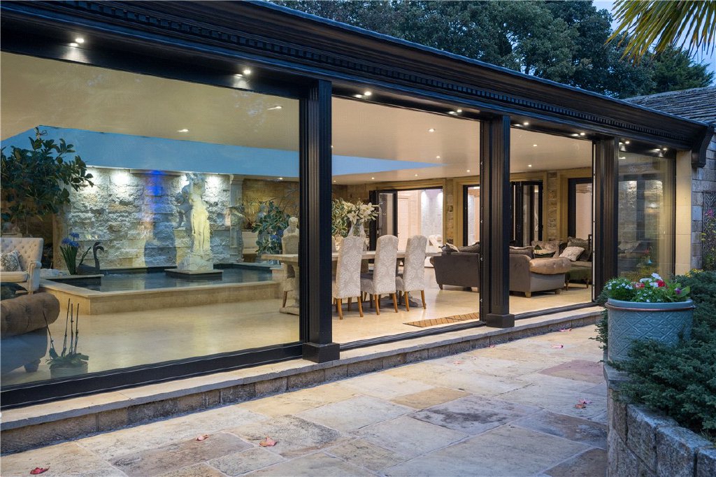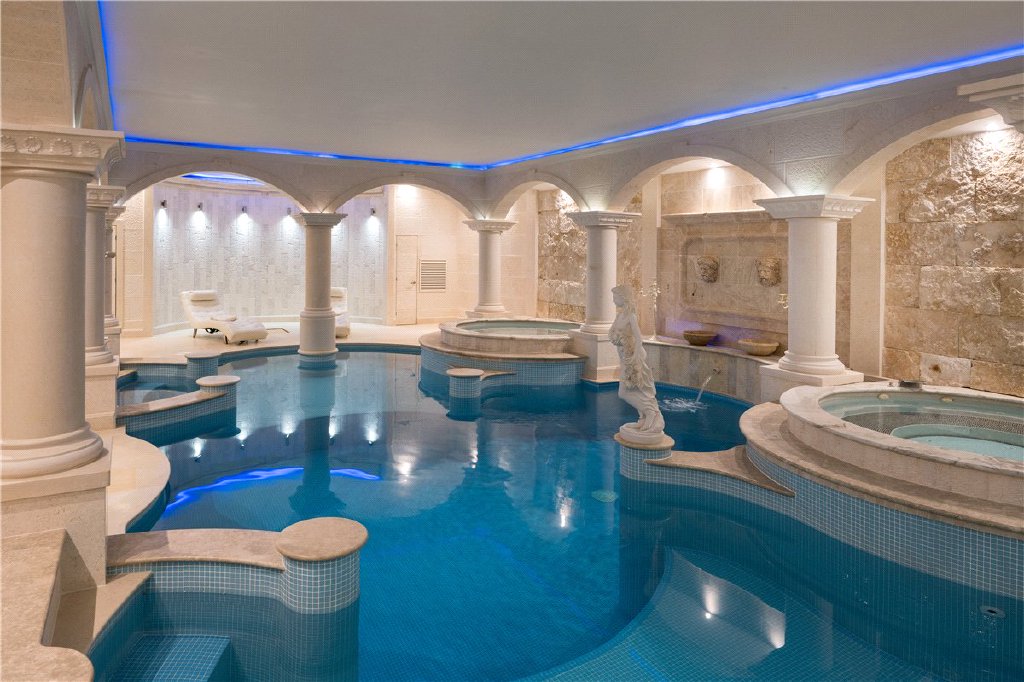 The living accommodation is accessed from a central oak panelled reception hall and includes three charming reception rooms featuring oak flooring and panelling, exposed beams and beautiful fireplaces together with bespoke fitted furniture. The bespoke kitchen and breakfast room were designed and fitted by Little London Interiors with a comprehensive range of hand painted units in cream with marble preparation surfaces and matching islands. A more recent addition to the accommodation is a truly spectacular leisure complex with separate living/dining area with bespoke fitted cocktail bar and stunning indoor water feature with waterfall. This then leads through into truly magnificent indoor heated swimming pool with twin Jacuzzis and “Romanesque” style features complemented by concealed mood lighting. Beyond is the gymnasium and a games/playroom.