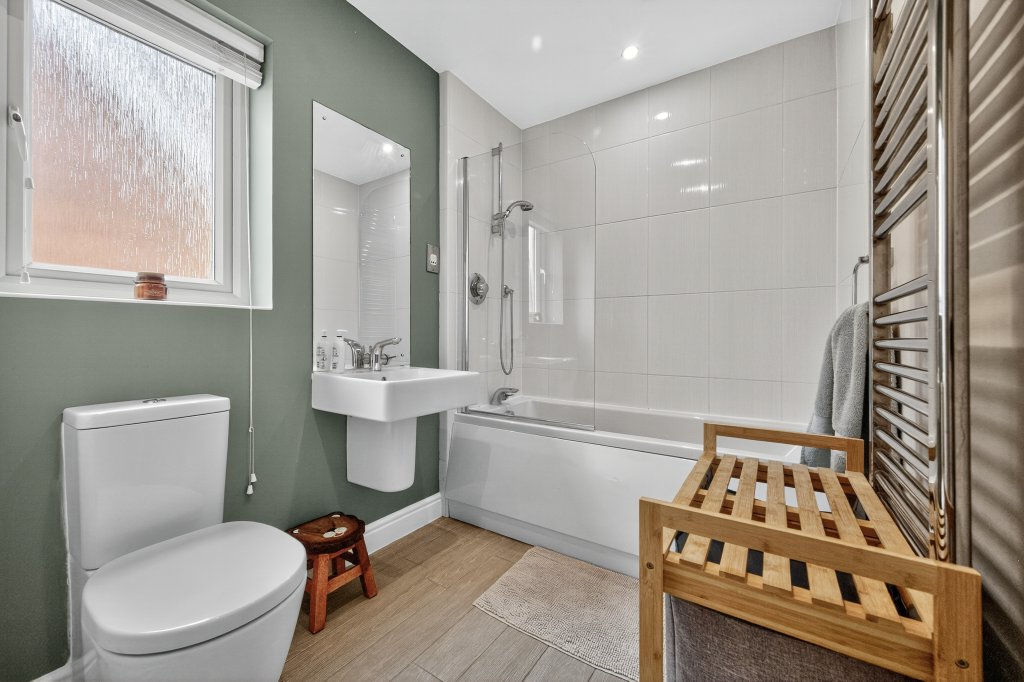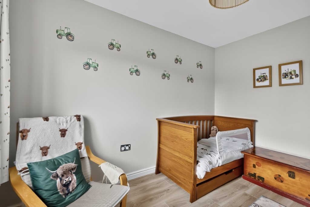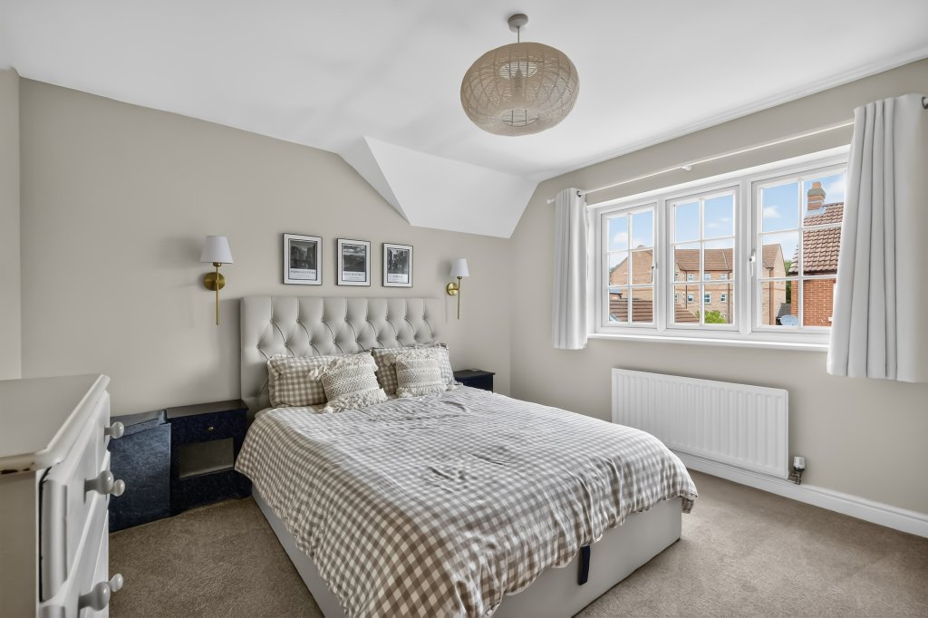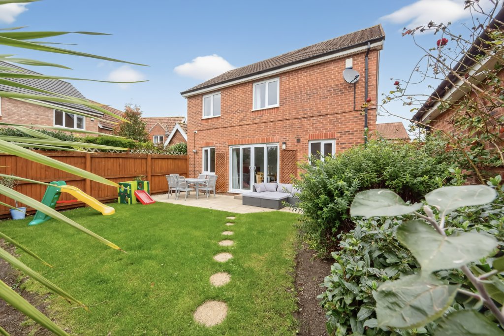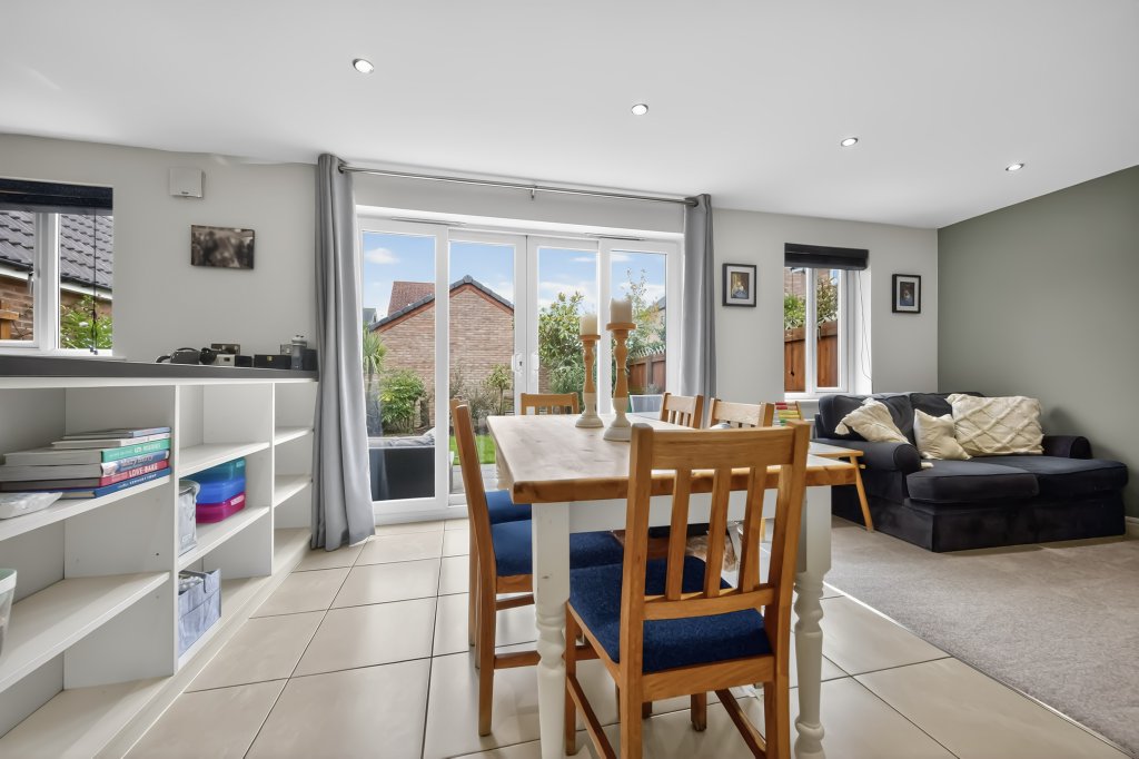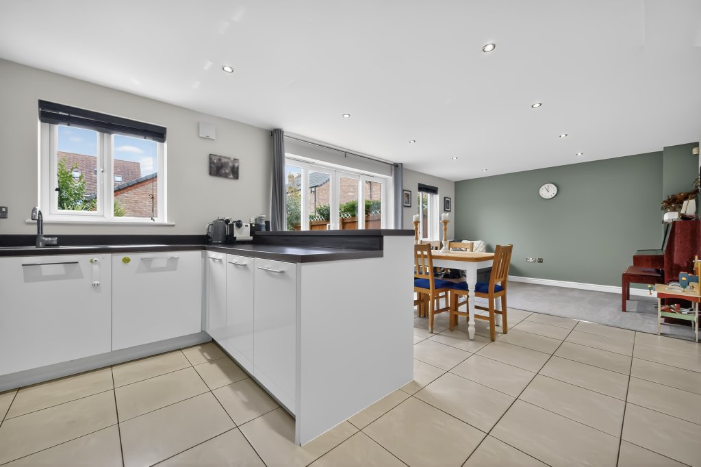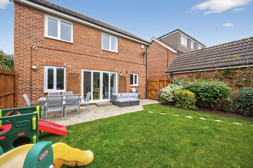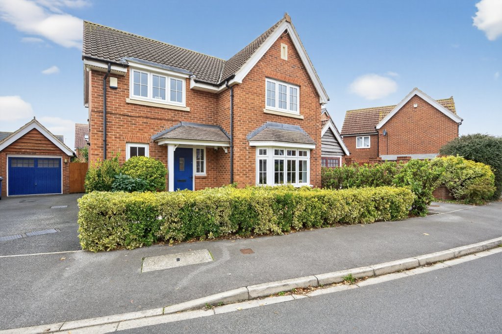 A beautifully presented four-bedroom detached family home, set within a sought-after residential development and boasting a superb south-facing rear garden. Offering spacious, versatile living accommodation, this property is ideal for families looking for comfort, style, and convenience. The property opens with an inviting entrance hallway, leading to a generously sized living room featuring a large front-facing bay window that floods the space with natural light. To the rear, the modern open-plan kitchen and dining area form the heart of the home — fitted with sleek cabinetry, integrated appliances, and patio doors that open directly onto the rear garden, creating a seamless indoor-outdoor flow perfect for entertaining. A separate utility room provides practical space for laundry and additional storage, while a ground floor cloakroom/WC adds everyday convenience. Upstairs, the property continues to impress with four well-proportioned bedrooms, including a spacious principal bedroom complete with fitted wardrobes and a modern en-suite shower room. The remaining bedrooms are well suited for family use, guest accommodation, or a home office. A stylish family bathroom serves the rest of the first floor, featuring a bath with overhead shower and contemporary finishes. Externally, this home enjoys a private, south-facing rear garden, designed for relaxation and outdoor enjoyment, with a combination of lawn and patio areas ideal for family gatherings or summer barbecues. To the front, there is a neatly maintained garden and a driveway providing off-street parking, along with a garage for additional storage or vehicle use.