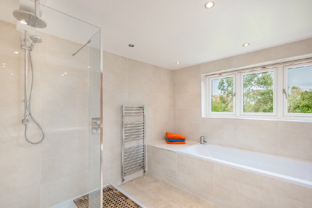 Four of the five remaining bedrooms benefit from built in storage and all five are serviced by a generous sized family bathroom and an additional guest shower room. The family bathroom has been completed to a high standard with his and hers basins, custom built storage and vanity unit, a large walk in rain shower, w/c, chrome towel rail and a separate bath.
