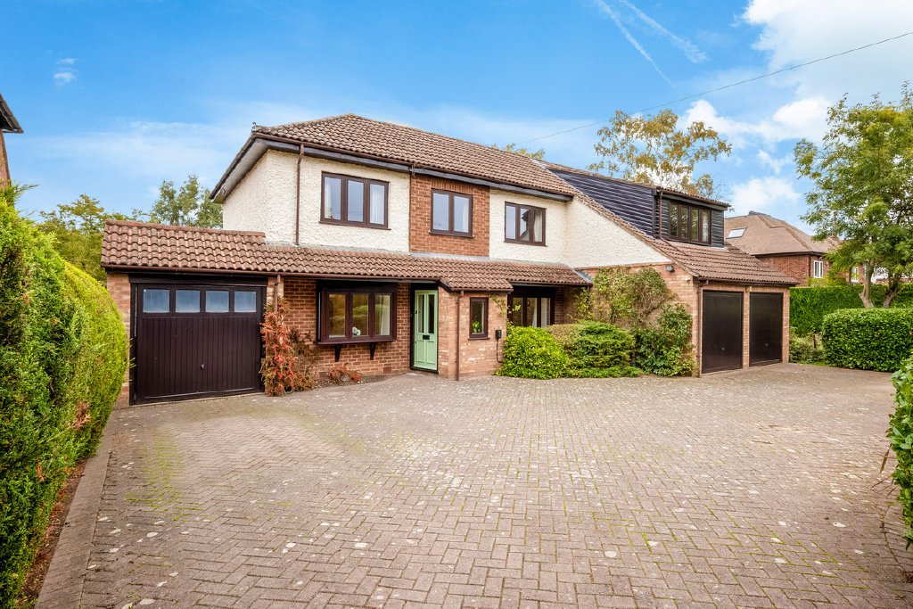 To the front of the property is a large block paved driveway with triple garaging providing ample parking for several vehicles.